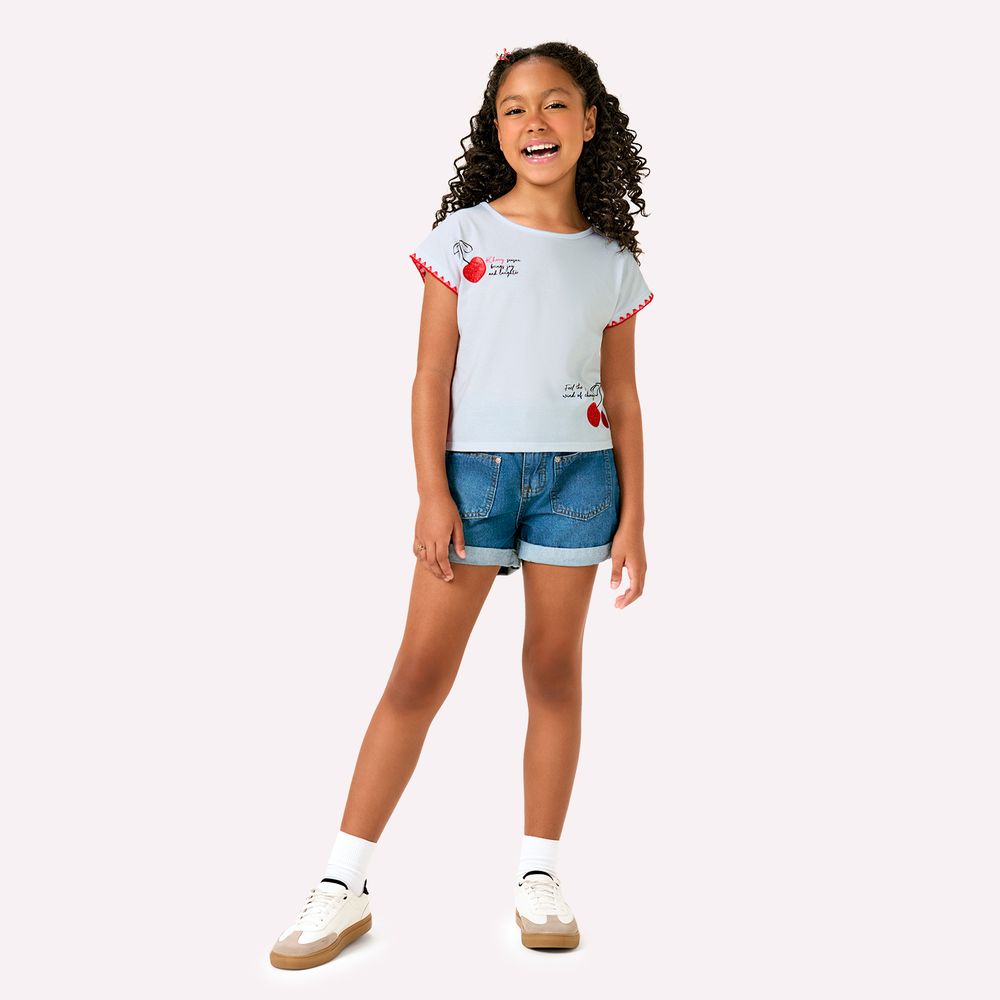 Os detalhes encantadores ficam por conta da estampa localizada de cerejinhas com glitter suave e lettering delicado, que traduzem o frescor e a leveza da estação. Ideal para compor looks casuais e alegres, essa blusa é perfeita para os dias de sol, passeios ou momentos especiais, combinando com shorts, saias ou calças com o mesmo frescor da infância.