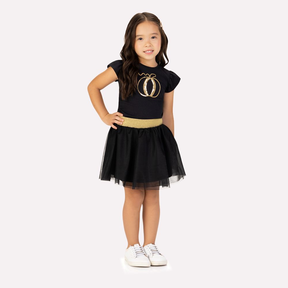 Confeccionada em cotton 95% algodão e 5% elastano, a peça oferece toque macio, elasticidade e ótimo caimento, garantindo conforto em cada movimento. O grande destaque é o bordado de abóbora em lantejoulas douradas, que brilha de forma delicada e traz um charme festivo irresistível.