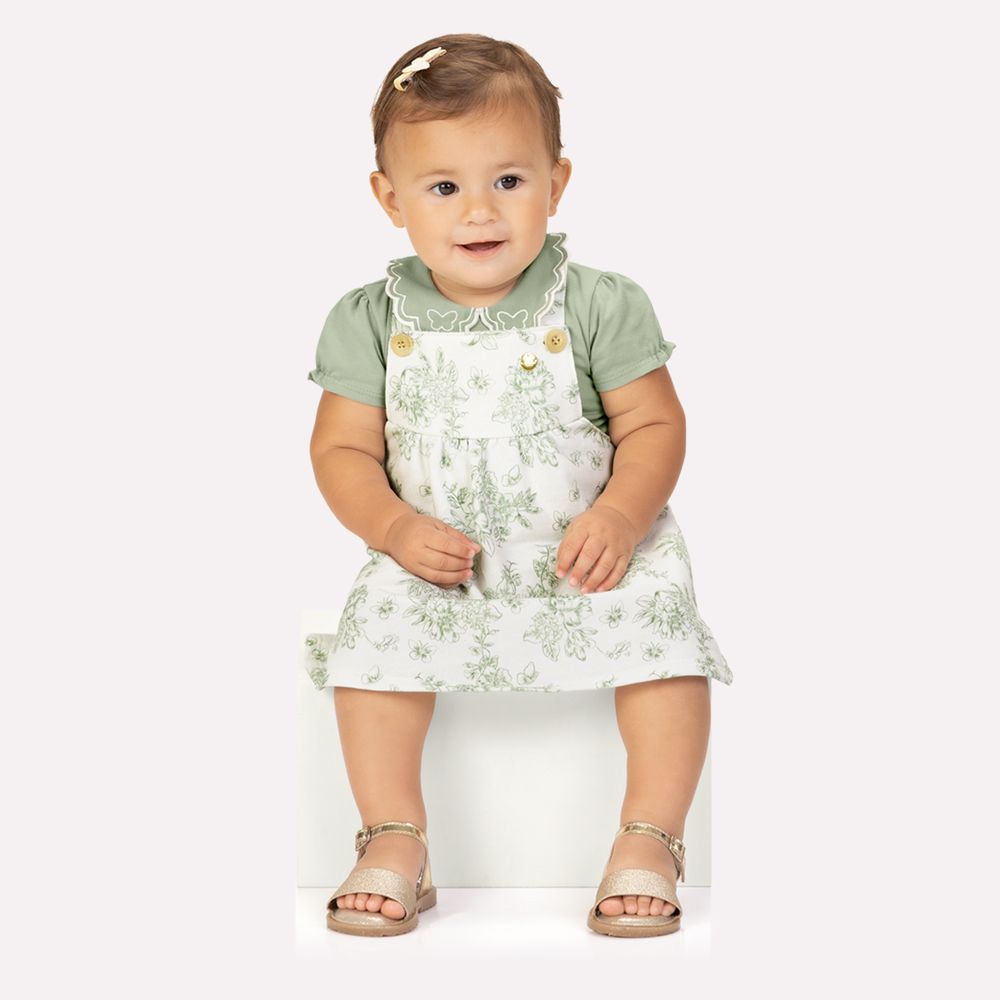 Compondo o look, a salopete em moletinho 100% algodão traz leveza e caimento gracioso. O destaque está na estampa rotativa de flores, que deixa a peça romântica e moderna, além da plaquinha Milon, que confere um toque sofisticado e exclusivo. A modelagem com alças e saia ampla dá movimento e delicadeza, criando um visual encantador. Um conjunto que combina charme, conforto e sofisticação, perfeito para deixar sua pequena ainda mais estilosa em momentos especiais.