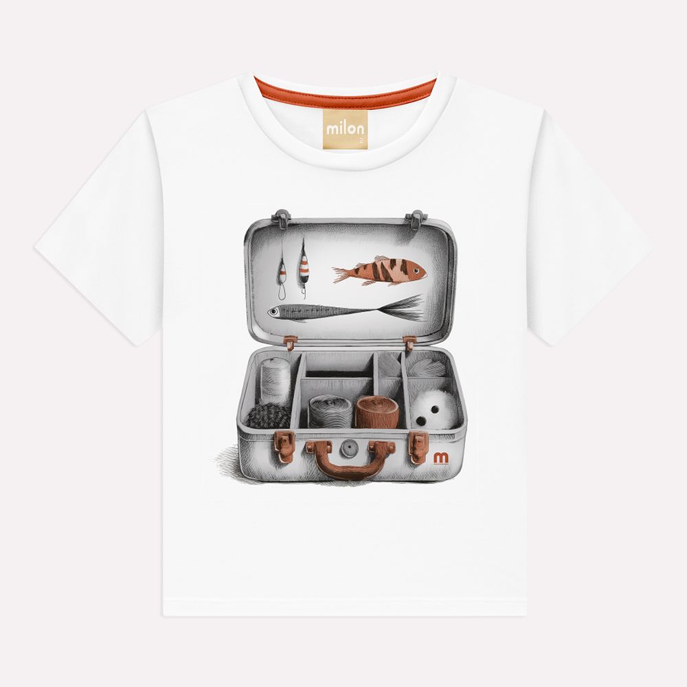O destaque fica por conta da estampa exclusiva de maleta de pescaria, com riqueza de detalhes que despertam a curiosidade e o espírito aventureiro das crianças. Uma camiseta encantadora, que une conforto, estilo e o toque criativo, perfeita para meninos cheios de personalidade!