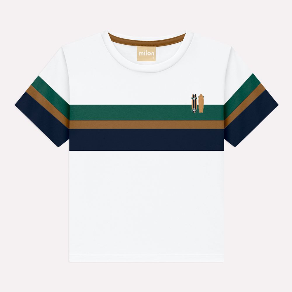 O destaque fica por conta das listras em blocos de cor nos tons de verde, marrom e marinho, que criam um visual moderno e equilibrado. A estampa minimalista de skates na altura do peito adiciona um toque divertido e cheio de personalidade, perfeito para meninos que adoram aventuras sobre rodas. Uma peça versátil e estilosa, que combina facilmente com bermudas ou jeans, ideal para compor looks casuais com o charme e a qualidade Milon.