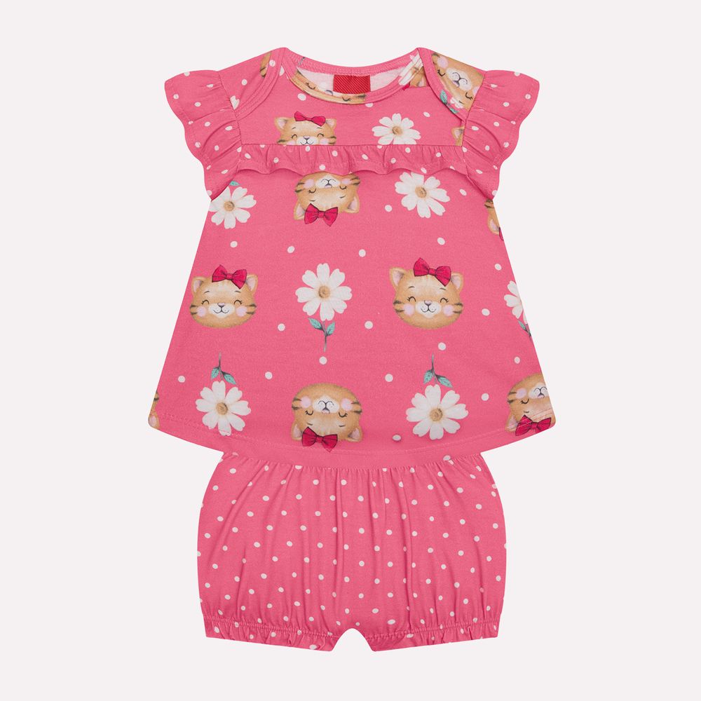 Confeccionado em meia malha 100% algodão, o conjunto é leve, respirável e perfeito para a pele sensível do bebê. A blusa com estampa rotativa de gatinhos, flores e bolinhas encanta com sua modelagem ampla e fluida, além dos babados franzidos, que dão um toque gracioso e sofisticado.