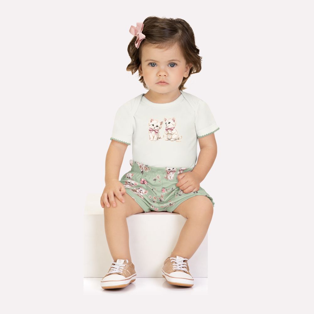 O short, também em cotton, complementa o visual com estampa rotativa de gatinhos, flores e lacinhos, em uma composição suave e encantadora. O cós franzido com babadinhos oferece ajuste confortável e um caimento ideal para acompanhar os movimentos das pequenas com liberdade e estilo. Um conjunto delicado e cheio de personalidade, perfeito para os dias alegres das meninas, com o toque refinado e amoroso que só a marca sabe oferecer.