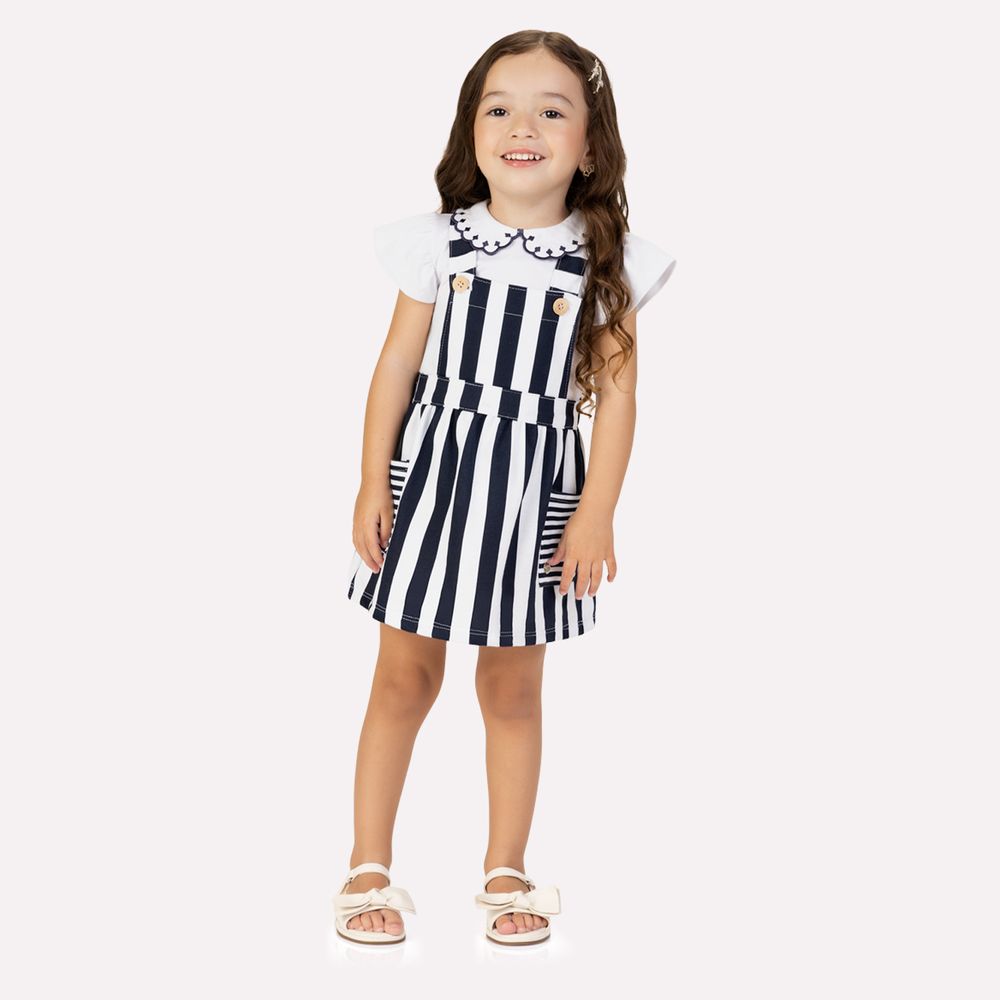 A salopete, confeccionada em moletinho sem felpa 100% algodão. Sua estampa rotativa em listras cria um visual moderno e elegante, enquanto os bolsos frontais dão um ar descontraído e funcional. A plaquinha exclusiva da marca completa o design com sofisticação. Um conjunto encantador, que combina frescor, conforto e estilo atemporal, perfeito para acompanhar as pequenas em momentos especiais com muito charme!