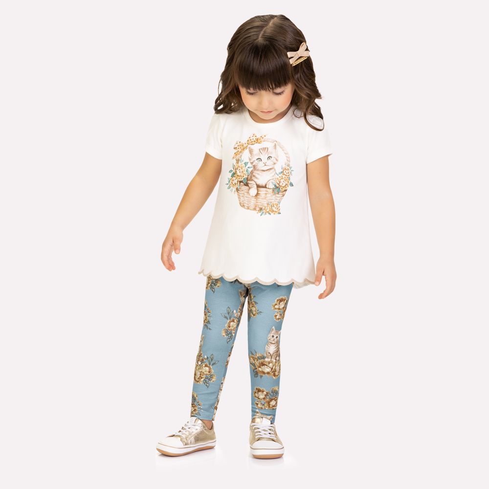 A legging em malha confortável de 94% algodão e 6% elastano, completa o conjunto com uma estampa rotativa de gatinhos e flores, que harmoniza perfeitamente com a blusa. Sua modelagem justa e elástica oferece conforto e liberdade para brincar com muito estilo. Um look encantador e sofisticado, perfeito para as pequenas que adoram brilho, fofura e o toque refinado da Milon.