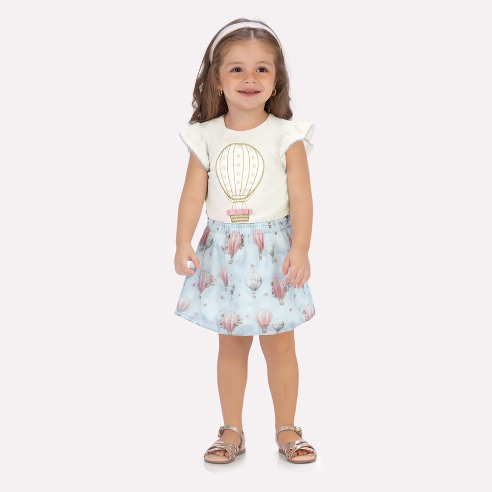 A saia em chiffon 100% poliéster, encanta com sua estampa de balões em sublimação, criando um efeito delicado e cheio de movimento. O forro com short interno em cotton garante conforto e liberdade para brincar com segurança, enquanto o cós com elástico oferece ajuste perfeito. Combinando leveza, brilho e um toque de magia, esse conjunto é ideal para as meninas que adoram sonhar alto e brilhar em cada detalhe!