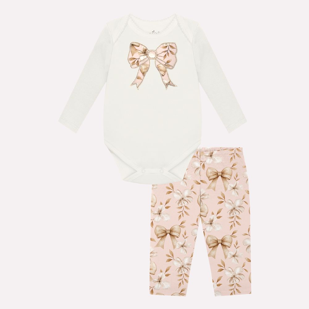 Delicado e encantador, este conjunto bebê menina da Milon celebra a suavidade da infância com uma composição elegante inspirada na beleza das flores e na delicadeza dos laços.