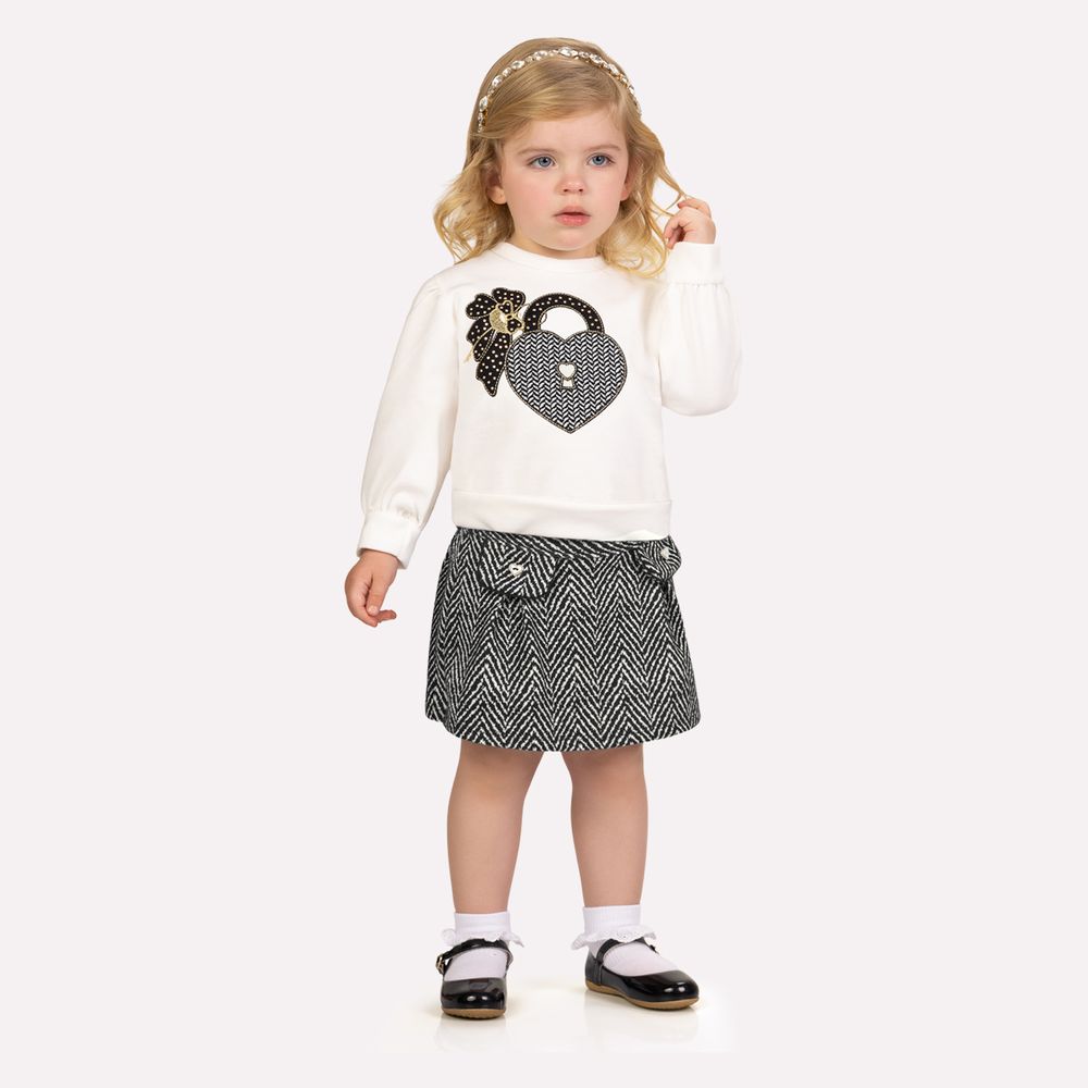 O short saia em jacquard, composto por 87% algodão, 12% poliéster e 1% elastano, complementa o conjunto com elegância. A textura do jacquard confere um visual sofisticado, enquanto os bolsos frontais com botões decorativos adicionam charme e acabamento refinado à peça. Perfeito para passeios, encontros em família ou ocasiões especiais, o conjunto infantil menina Milon une conforto, estilo e delicadeza em um look irresistível.