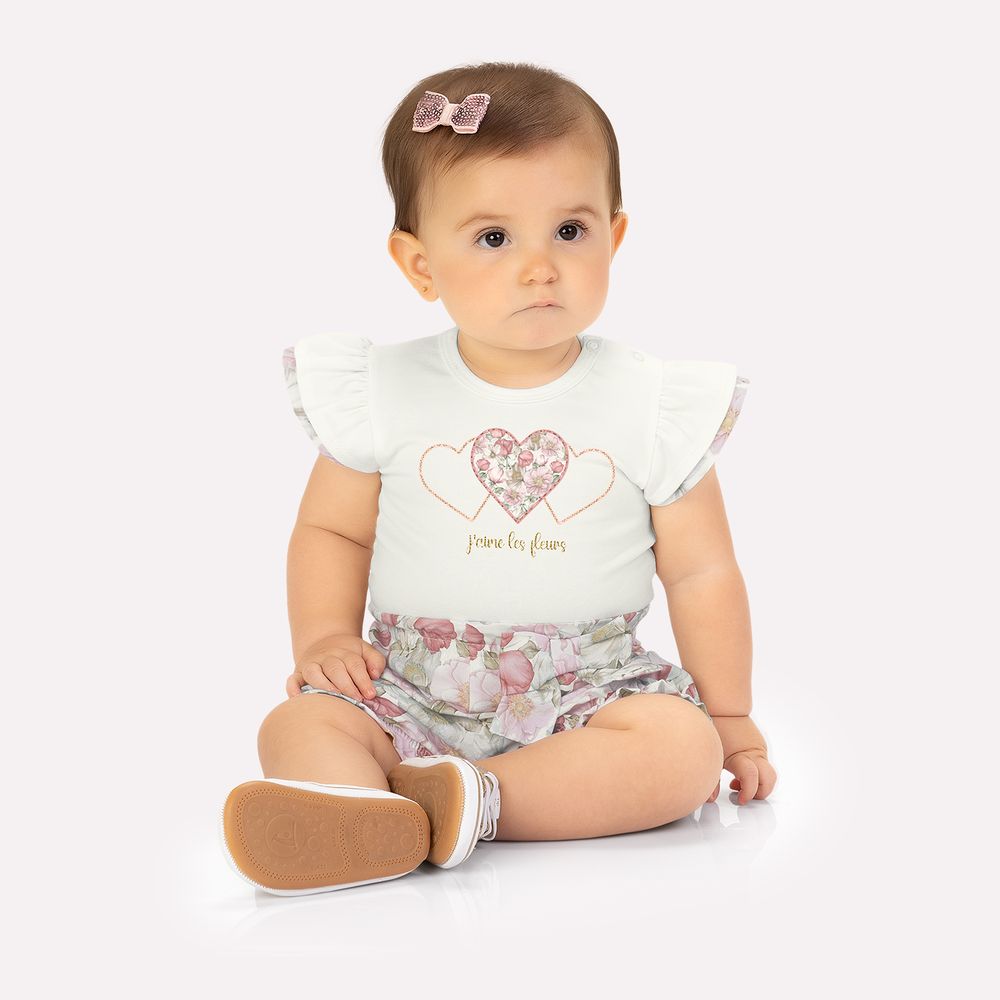 O conjunto bebê menina Milon combina conforto, beleza e detalhes encantadores em um visual leve e delicado. O body é confeccionado em cotton 95% algodão e 5% elastano, com toque macio e elasticidade ideal para o dia a dia da bebê. Sua modelagem ajustada valoriza o conforto e facilita o vestir com abertura no ombro e entrepernas com acabamento em debrum e fechamento por botões de pressão. O destaque fica por conta do bordado de corações e do lettering. As manguinhas são duplas com franzido, unindo estrutura e charme em cada detalhe.