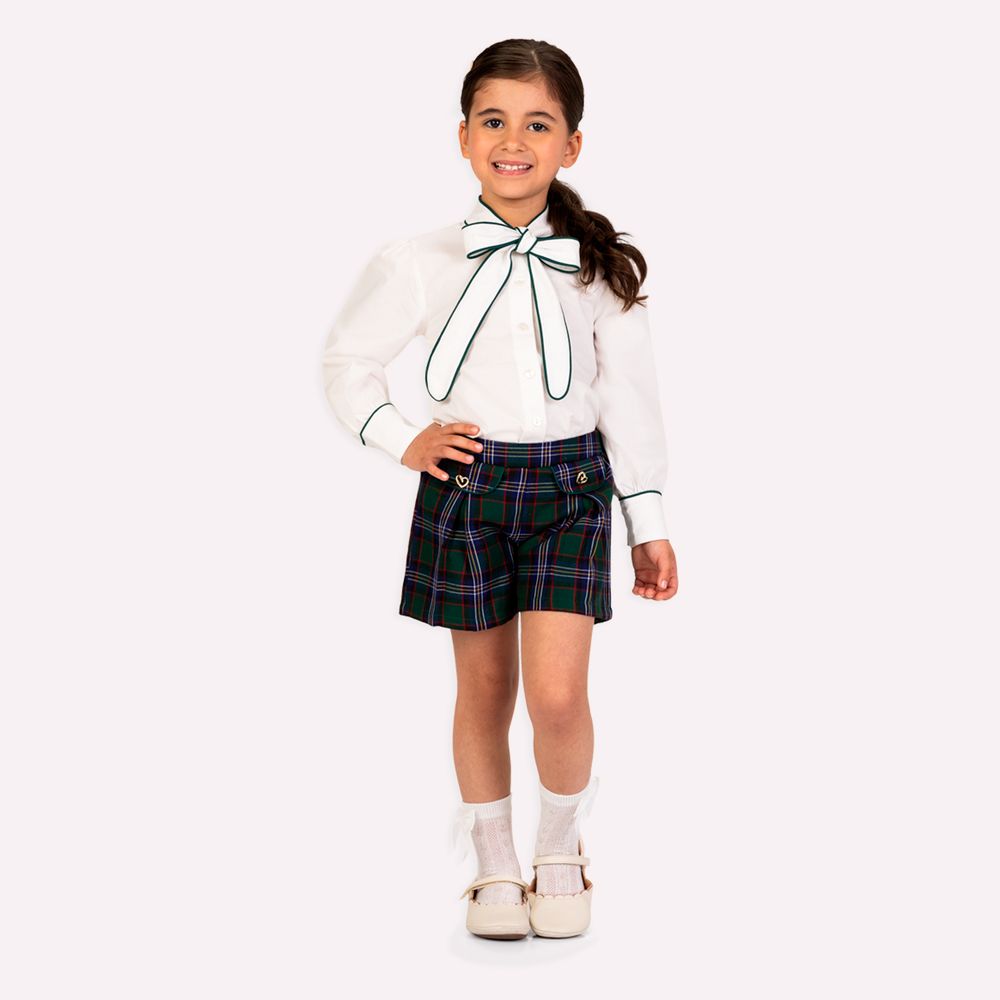 O short é confeccionado em tweed 100% poliéster com forro em 100% algodão, garantindo conforto e estrutura. A estampa xadrez em tons de verde cria um visual clássico e elegante. A modelagem conta com pregas frontais e lapelas decorativas com delicados botões em formato de coração, que acrescentam charme e refinamento ao look. Ideal para festas, eventos ou momentos especiais, o conjunto infantil menina Milon une conforto, elegância e detalhes sofisticados em uma composição moderna e encantadora.