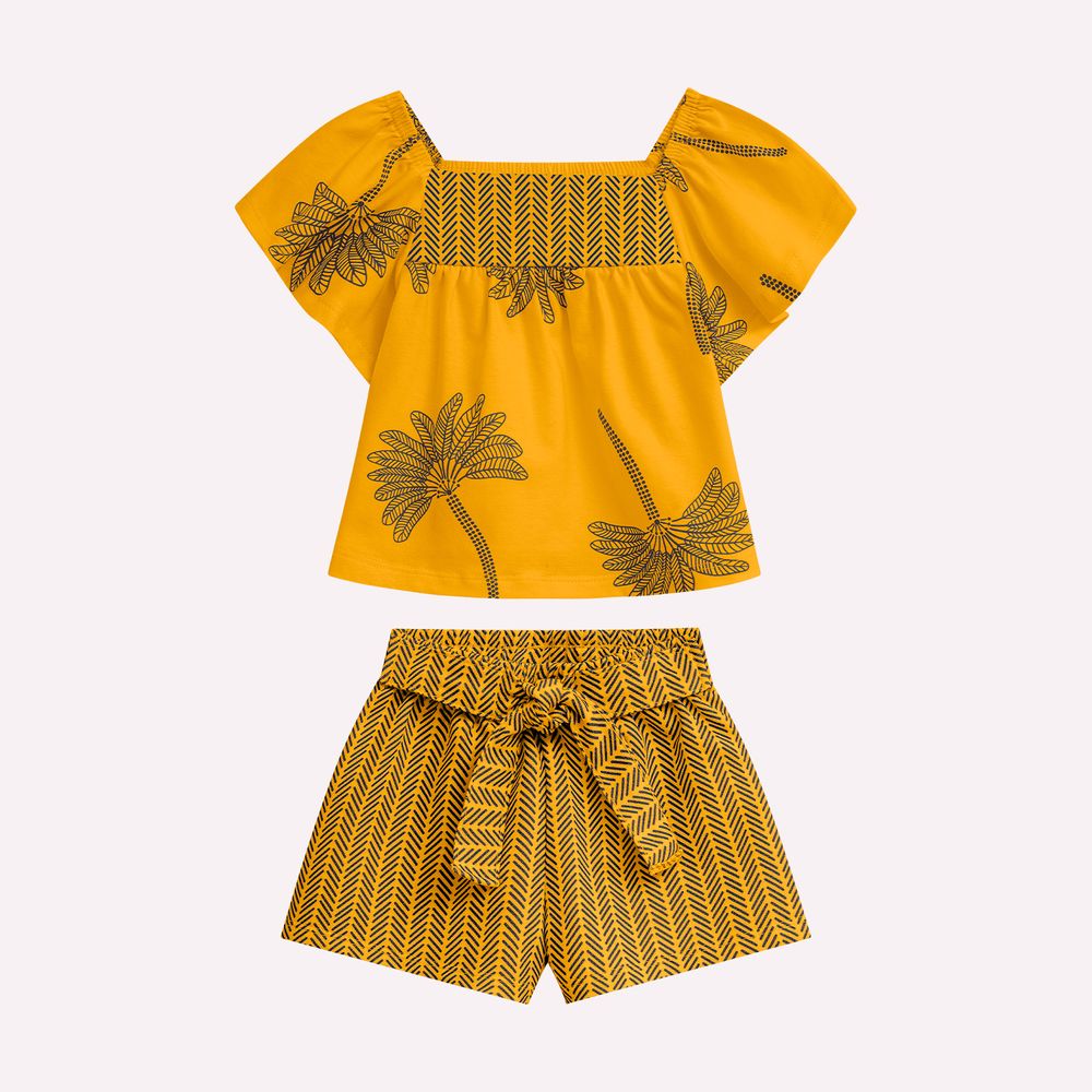 O short, com cintura em elástico rebatido e modelagem solta. O cinto decorativo em fita, é aplicado sobreposto nas laterais, com estampa rotativa. Combinando funcionalidade e charme, o conjunto é ideal para composições frescas e cheias de estilo, oferecendo uma leitura atual da moda infantil com qualidade e atenção aos detalhes.