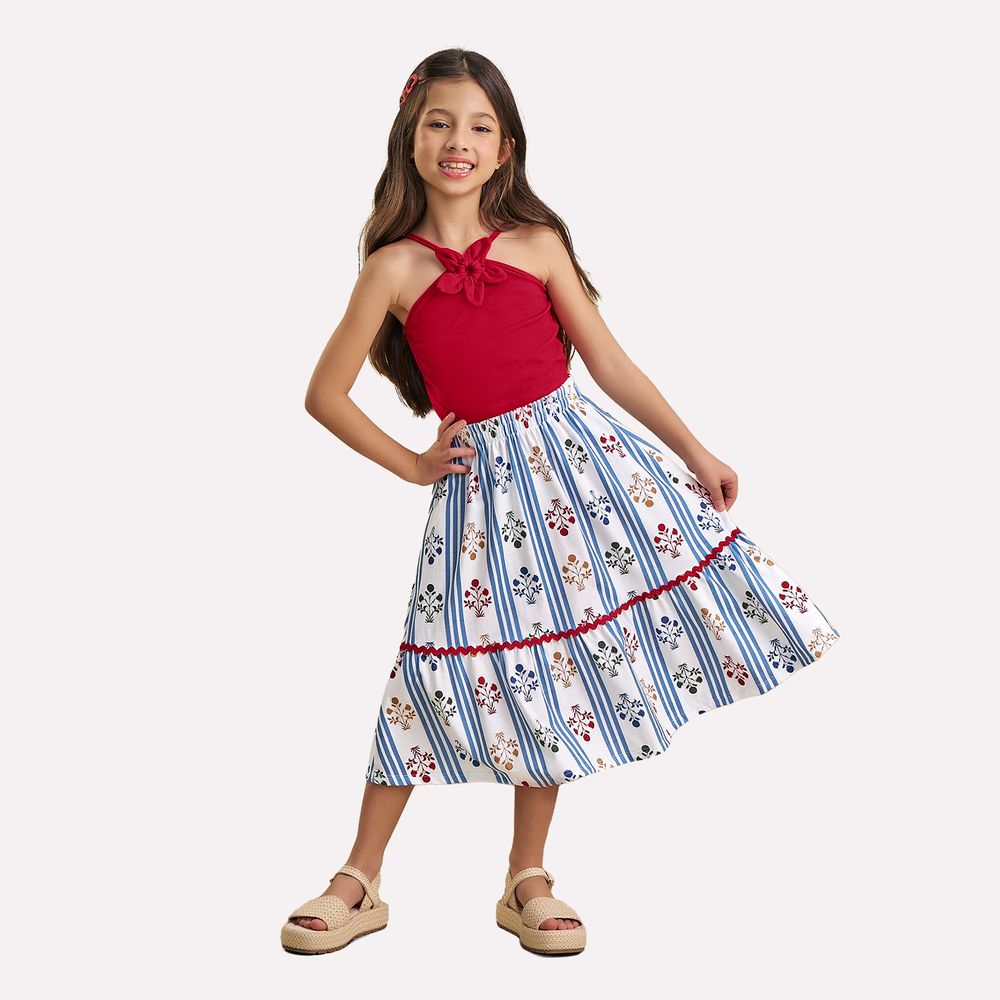 A saia midi em meia malha 100% algodão, apresenta uma estampa rotativa colorida, com padronagem suave e alegre que remete à delicadeza das brincadeiras de verão. O babado na barra com aplicação de aviamento adiciona movimento e volume na medida certa, resultando em um caimento fluido e encantador. Com uma modelagem leve e feminina, o conjunto é perfeito para os dias de sol, seja para um passeio em família, uma festa ao ar livre ou momentos especiais cheios de conforto e estilo, sendo ideal para meninas que amam brincar com charme!