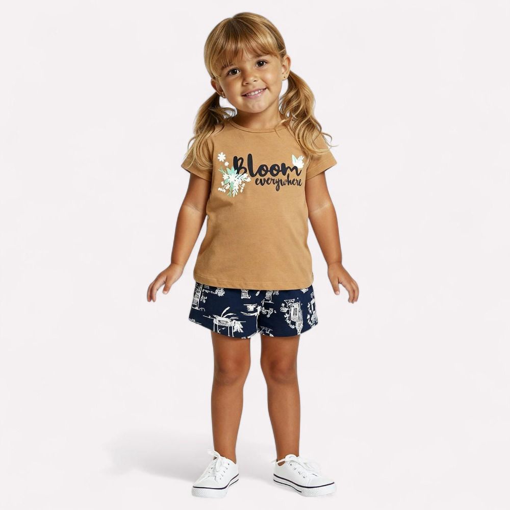 Alegria e estilo em cada detalhe! O conjunto infantil menina Kyly conta com blusa confeccionada em cotton 95% algodão e 5% elastano, traz estampa moderna em lettering com flores delicadas, que transmite charme e atitude para o visual infantil. Apresenta decote redondo finalizado em debrum e mangas curtas.