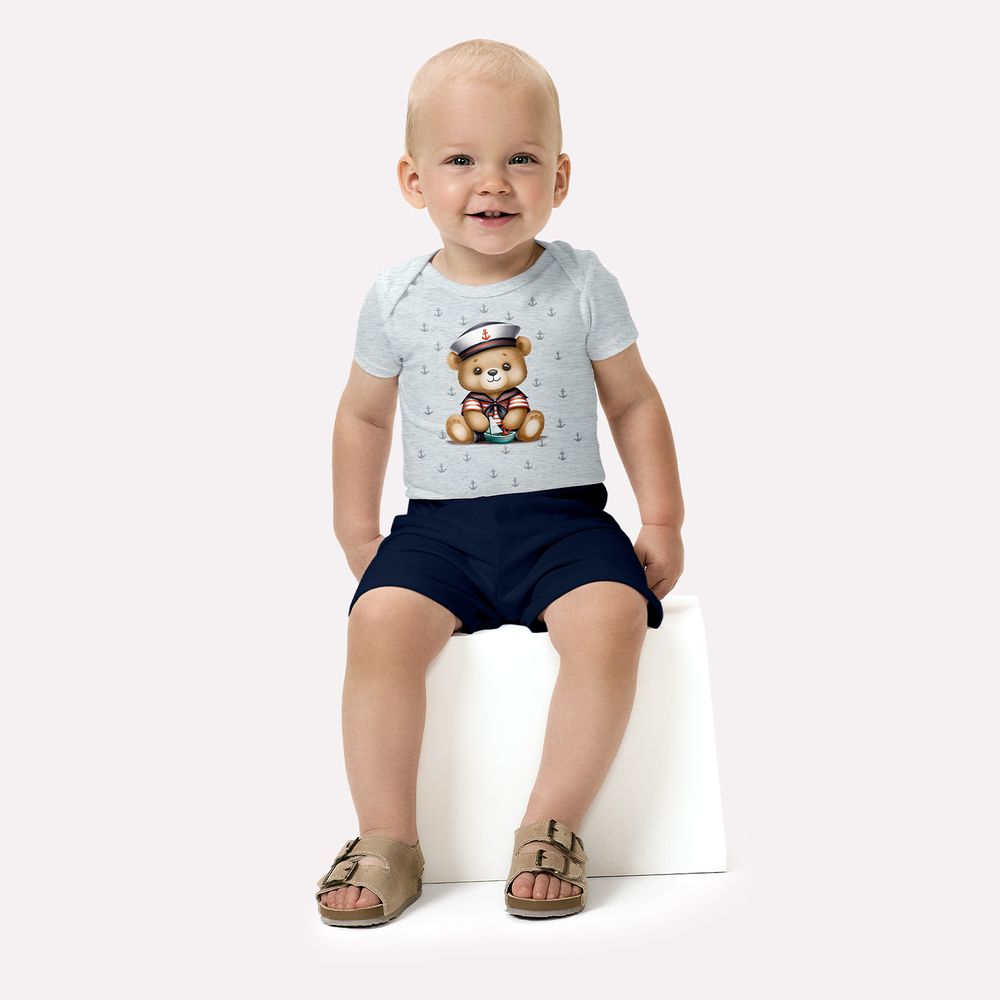 O destaque da peça fica por conta da charmosa estampa localizada com ursinho marinheiro, que ganha ainda mais personalidade com o patch aplicado, um detalhe especial que valoriza o visual. A modelagem do body conta abertura prática entrepernas, pensada para facilitar o vestir e a troca de fraldas. A bermuda, com elástico confortável no cós, tem caimento soltinho que permite mobilidade durante as descobertas do dia a dia. Delicado, funcional e cheio de estilo, este conjunto é perfeito para deixar os momentos de brincadeira e descanso ainda mais especiais.