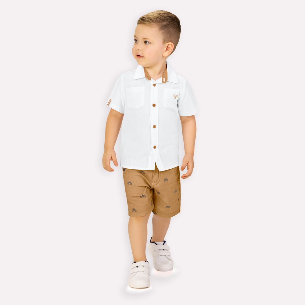 A bermuda, produzida em sarja leve 100% algodão, combina caimento estruturado e frescor para os dias quentes. Seu design conta com cós com passantes para cinto, fechamento por botão e zíper, além de bolsos funcionais que aumentam a praticidade. A estampa rotativa de raquetes dá um toque divertido e harmoniza perfeitamente com o bordado da camisa, criando um conjunto cheio de personalidade. Um look refinado e confortável, ideal para eventos, passeios e encontros em família, unindo qualidade, estilo e detalhes encantadores.