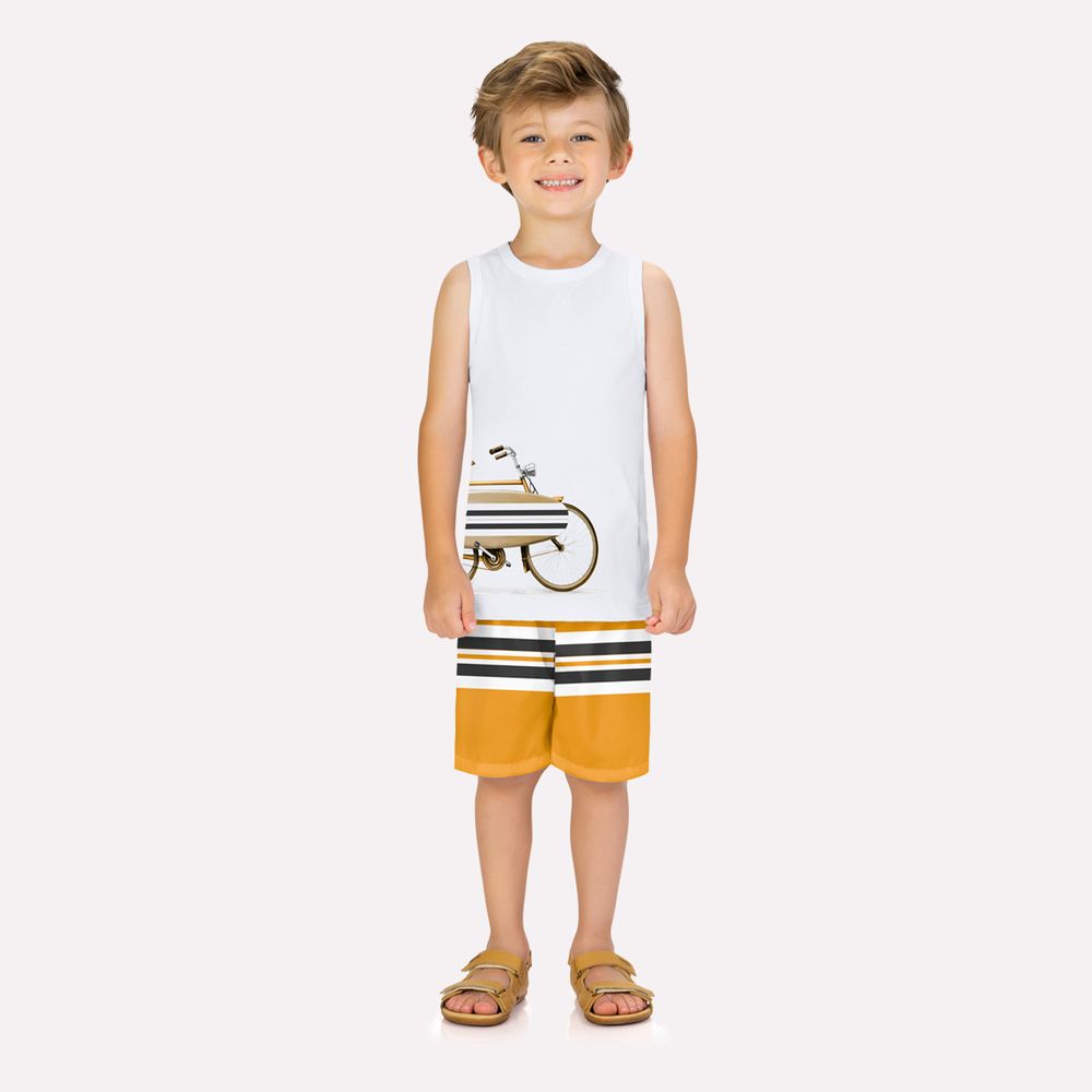 Cheio de energia e com um visual que é a cara do verão, o conjunto infantil menino Milon é perfeito para dias ensolarados e momentos de lazer à beira-mar ou na cidade. A regata, confeccionada em meia malha 100% algodão, oferece toque suave, excelente respirabilidade e conforto durante todo o dia. Sua modelagem garante liberdade total de movimentos, enquanto a estampa frontal, que combina uma bicicleta estilizada com prancha de surfe, traz um ar descontraído e divertido, ideal para o clima praiano.