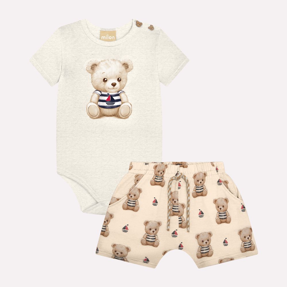 A bermuda que compõe o conjunto é feita em moletinho 100% algodão, um tecido leve, fresco e ideal para o dia a dia. Sua modelagem soltinha com cós elástico rebatido e amarração decorativa oferece ajuste confortável e seguro. A estampa rotativa com ursinhos e barquinhos adiciona um toque lúdico e harmoniza perfeitamente com o body, criando um visual divertido. Este conjunto é ideal para momentos de lazer, passeios em família e até registros fotográficos, proporcionando conforto, liberdade e muito estilo.