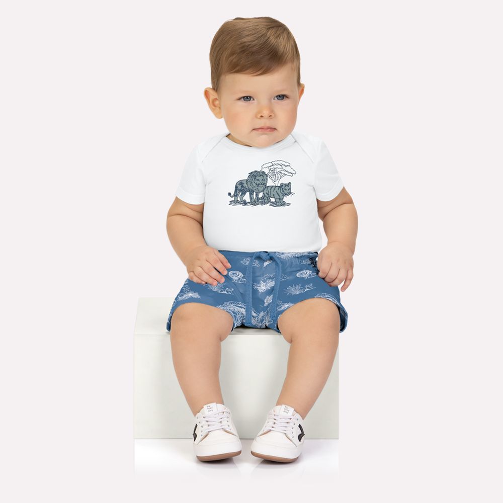 A bermuda, feita em moletinho 100% algodão, complementa o conjunto com estampa rotativa de bichinhos, árvores e paisagens selvagens em tons suaves, criando um visual moderno e harmonioso. O cós elástico garante ajuste perfeito e liberdade para o bebê se movimentar com muito conforto. Um conjunto fofo e elegante, ideal para acompanhar cada descoberta do seu pequeno com o aconchego e o estilo inconfundível da Milon.