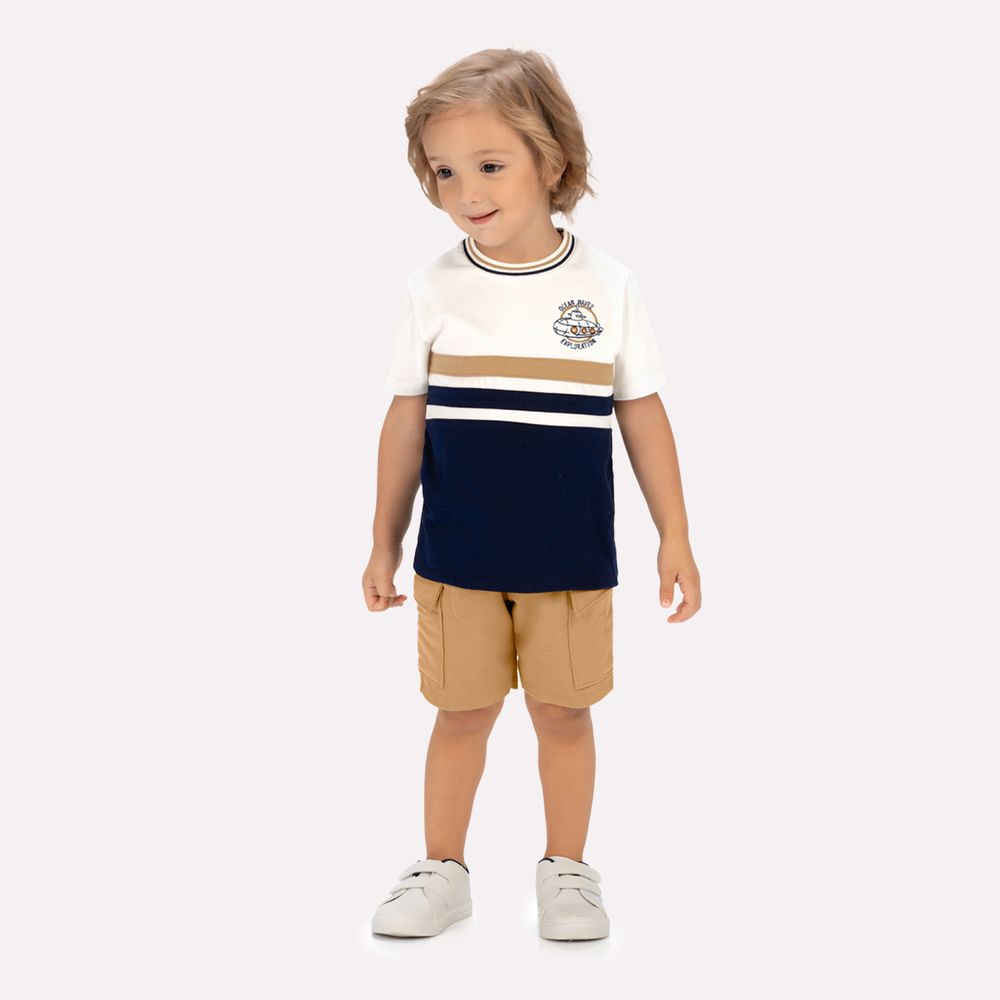 O conjunto infantil menino Milon com design moderno e confortável, esse conjunto é perfeito para acompanhar as aventuras do dia a dia. A camiseta em meia malha 100% algodão é leve, fresca e super macia, proporcionando bem-estar em todos os momentos. Sua modelagem tradicional com gola redonda traz ótimo caimento, enquanto as listras em contraste dão um ar esportivo e atual. O destaque especial fica para o bordado de submarino, que adiciona um toque lúdico e encantador à peça.