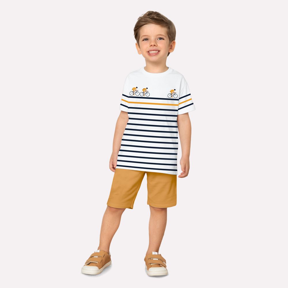 O conjunto infantil menino Milon é um look cheio de movimento e estilo, pensado para acompanhar os meninos em cada aventura com conforto e charme. A camiseta em meia malha 100% algodão é leve e macia, garantindo frescor nos dias mais ativos. Sua modelagem clássica com gola redonda proporciona ótimo caimento, enquanto o destaque fica para a estampa localizada de ciclistas que pedalam sobre as listras horizontais, criando um visual moderno e divertido, perfeito para estimular a imaginação dos pequenos.