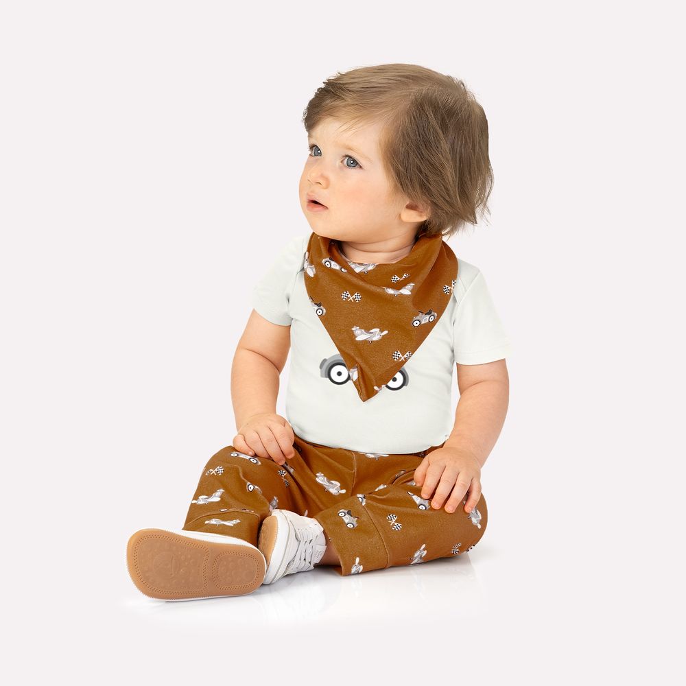 A calça, confeccionada no mesmo tecido macio, possui estampa rotativa de carrinhos, com cós elástico confortável que garante ajuste perfeito e liberdade de movimentos. O babador completa o conjunto com charme e praticidade, além de proteger a roupinha durante as refeições. Estampado em harmonia com a calça, adiciona um toque moderno e funcional ao look. Com esse conjunto Milon, cada detalhe foi pensado para unir conforto, praticidade e estilo, deixando o bebê ainda mais encantador em todas as ocasiões.