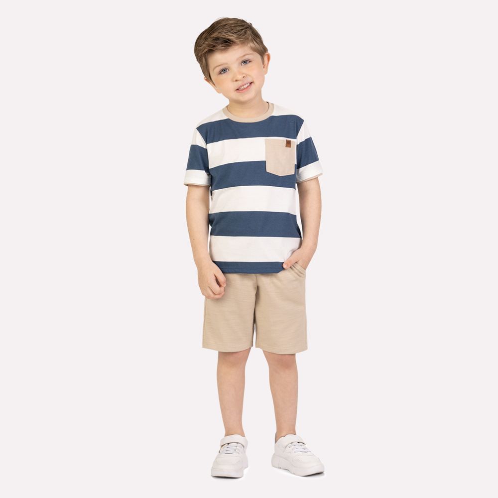 Com um charme atemporal e aquele toque fofo que conquista à primeira vista, o conjunto infantil menino Milon foi pensado para acompanhar os pequenos com conforto, estilo e delicadeza em cada detalhe. A camiseta é confeccionada em meia malha 100% algodão, garantindo toque macio e excelente respirabilidade para o dia a dia. O visual listrado traz um ar clássico e sofisticado, enquanto a modelagem reta proporciona caimento leve e confortável. O bolso frontal aplicado adiciona um detalhe funcional e moderno, enriquecendo o design com sutileza e personalidade.