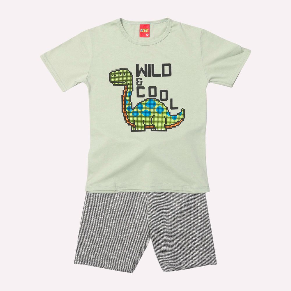 O conjunto infantil menino Kyly apresenta camiseta confeccionada em meia malha leve 100% algodão, com toque macio e respirável. A estampa localizada de dinossauro com lettering "Wild & Cool" traz um ar descolado ao visual. Com gola redonda e caimento confortável, é prática e charmosa para o dia a dia.