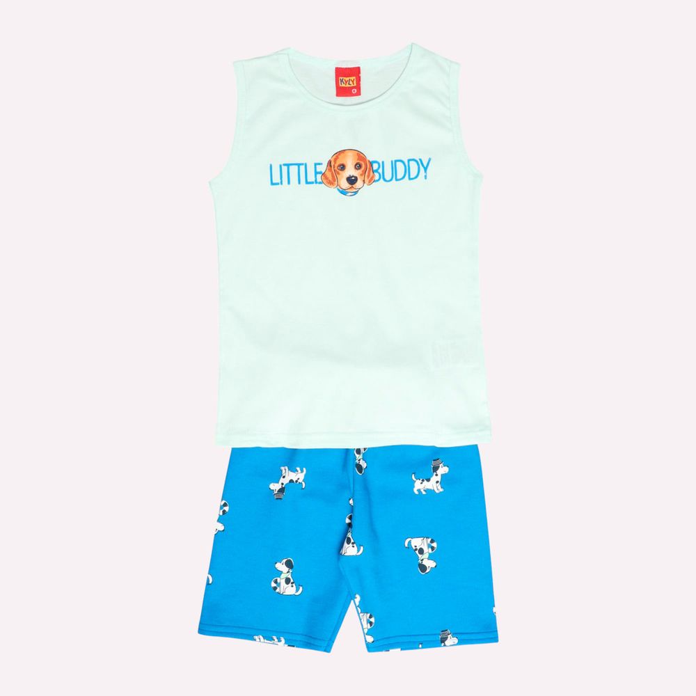O conjunto infantil menino Kyly conta com regata confeccionada em meia malha 100% algodão, com toque leve, perfeito para os dias quentes. A estampa localizada com o lettering Little Buddy e a carinha de cachorrinho traz simpatia e encanto.