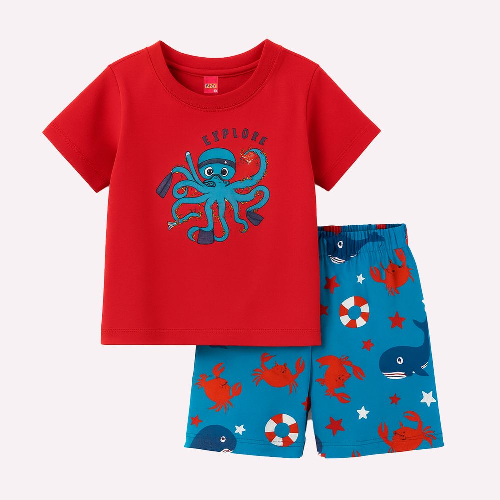 A camiseta é elaborada em meia malha 100% algodão, com estampa de polvo, elementos marinhos e lettering “Explore”, que tornam a peça lúdica e cheia de alegria. A modelagem clássica com gola redonda é prática e confortável para o uso diário.