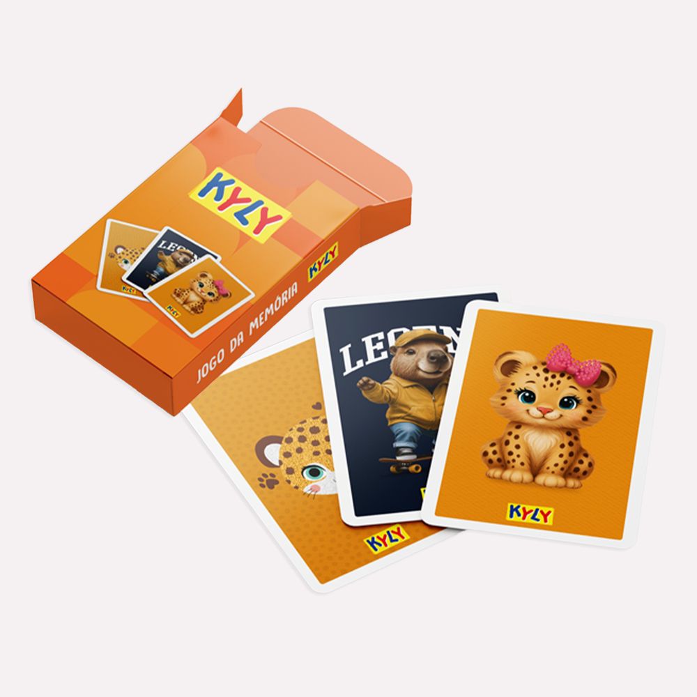 A embalagem em caixa, apresenta design vibrante em tons de laranja, com identidade visual destacada da marca Kyly e ilustrações encantadoras dos personagens. Prática e fácil de armazenar, mantém as cartas organizadas e protegidas, sendo ideal para levar em viagens, passeios ou para brincar em casa.