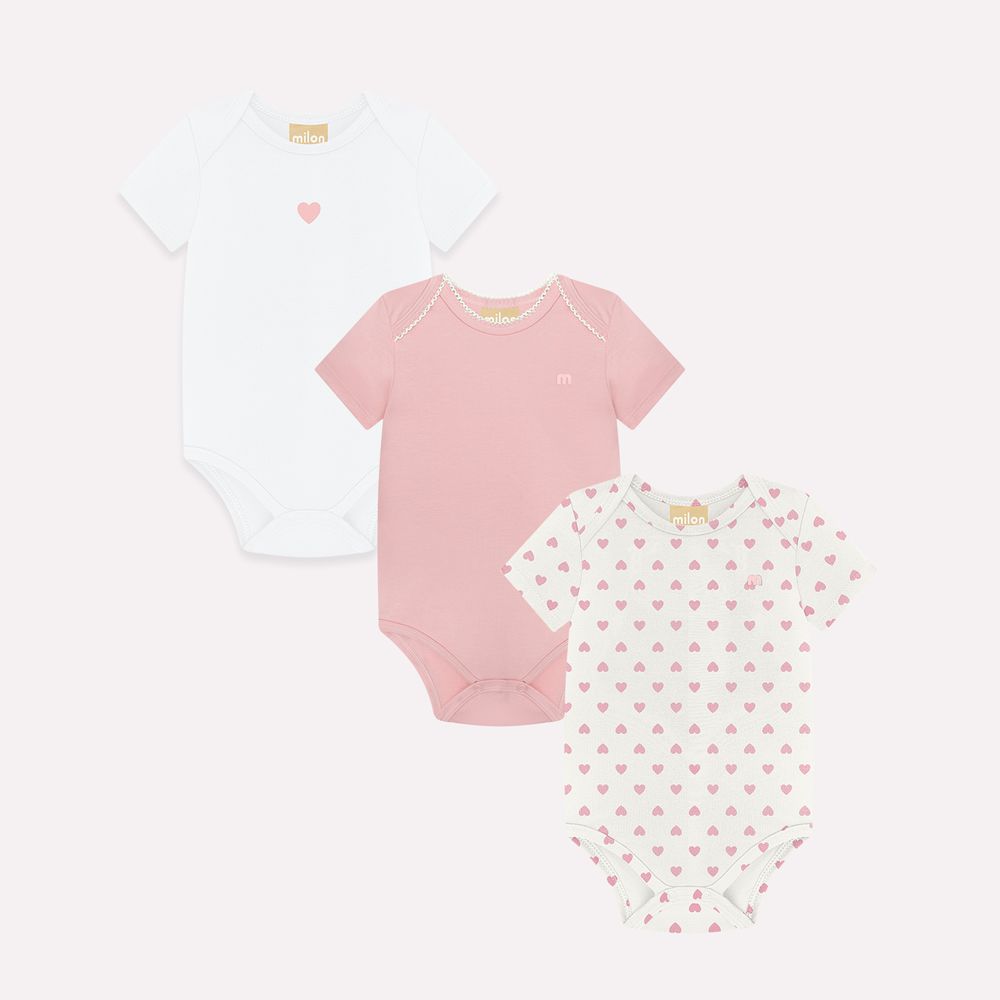 O conjunto é composto por três opções encantadoras: Um body liso, clássico e versátil, com o termocolante da marca Milon aplicado no peitinho; Um body com estampa de corações delicados, que traz um ar romântico e doce; E um body branquinho com coração minimalista, cheio de ternura e sutileza.