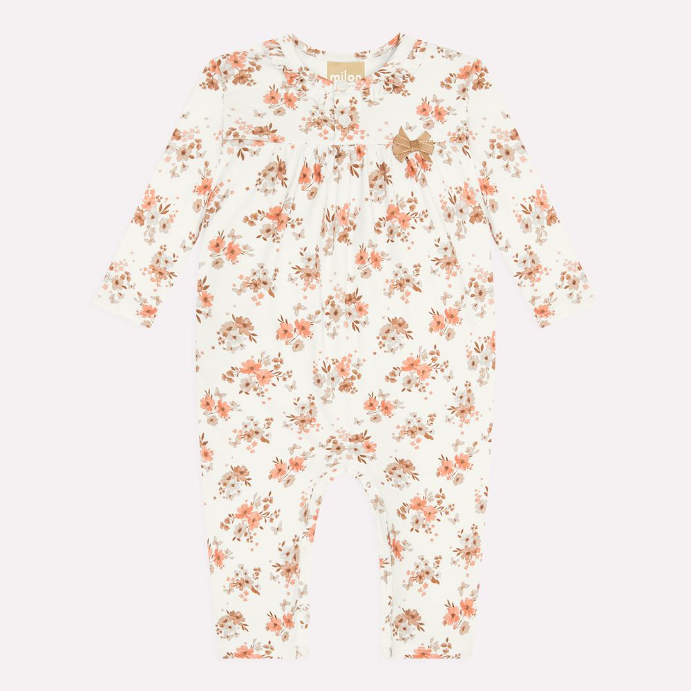 Confeccionado em suedine 100% algodão, o macacão oferece toque extremamente macio, respirabilidade e conforto ideal para a pele sensível do bebê. A modelagem confortável acompanha os movimentos com leveza, proporcionando liberdade para o dia a dia. A peça recebe estampa rotativa com delicada estampa de flores em tons suaves, criando uma composição romântica e sofisticada inspirada na natureza. O recorte na altura do peito com leve franzido acrescenta movimento e charme ao visual, enquanto a gola delicadamente trabalhada valoriza o acabamento da peça. O destaque fica por conta do pequeno laço aplicado no peito, que adiciona um toque gracioso e feminino ao design.