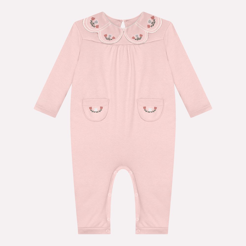 Confeccionado em suedine 100% algodão, o macacão oferece toque extremamente macio, respirabilidade e conforto ideal para a pele sensível do bebê. A modelagem confortável acompanha os movimentos com leveza, garantindo bem-estar durante todo o uso. O design apresenta visual liso e sofisticado, valorizado por uma gola delicada com bordado de pequenas flores, que acrescenta um toque romântico e refinado à peça. Na parte frontal, o leve franzido abaixo da gola cria movimento suave e charme adicional ao visual.