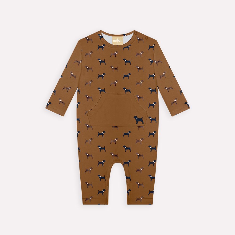 A estampa rotativa de cachorrinhos confere ao macacão um toque adorável e lúdico, trazendo alegria e charme para a roupa do bebê. O bordado delicado no bolso, com um cachorrinho bordado, complementa a estampa com um toque de sofisticação e cuidado, agregando um detalhe sutil, porém encantador, à peça.