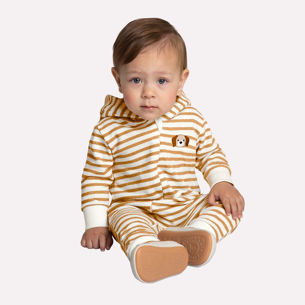 O design listrado traz um charme atemporal, enquanto o capuz forrado em 100% algodão garante ainda mais maciez. Como um detalhe encantador, o capuz conta com orelhinhas aplicadas, adicionando um toque lúdico e irresistível à peça. O bordado delicado de cachorrinho confere ainda mais fofura e exclusividade ao macacão.