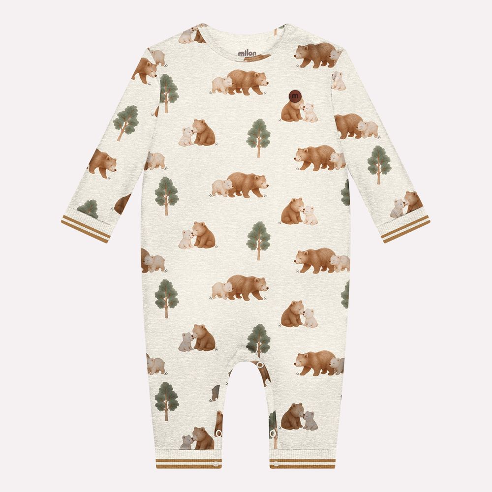 Confeccionado em suedine 100% algodão, o macacão oferece toque extremamente macio, excelente respirabilidade e conforto ideal para a pele sensível do bebê. A modelagem confortável acompanha os movimentos com liberdade, proporcionando bem-estar durante todo o uso. A peça recebe estampa rotativa com ursinhos e elementos inspirados na floresta, criando uma composição delicada e harmoniosa que valoriza o universo infantil.