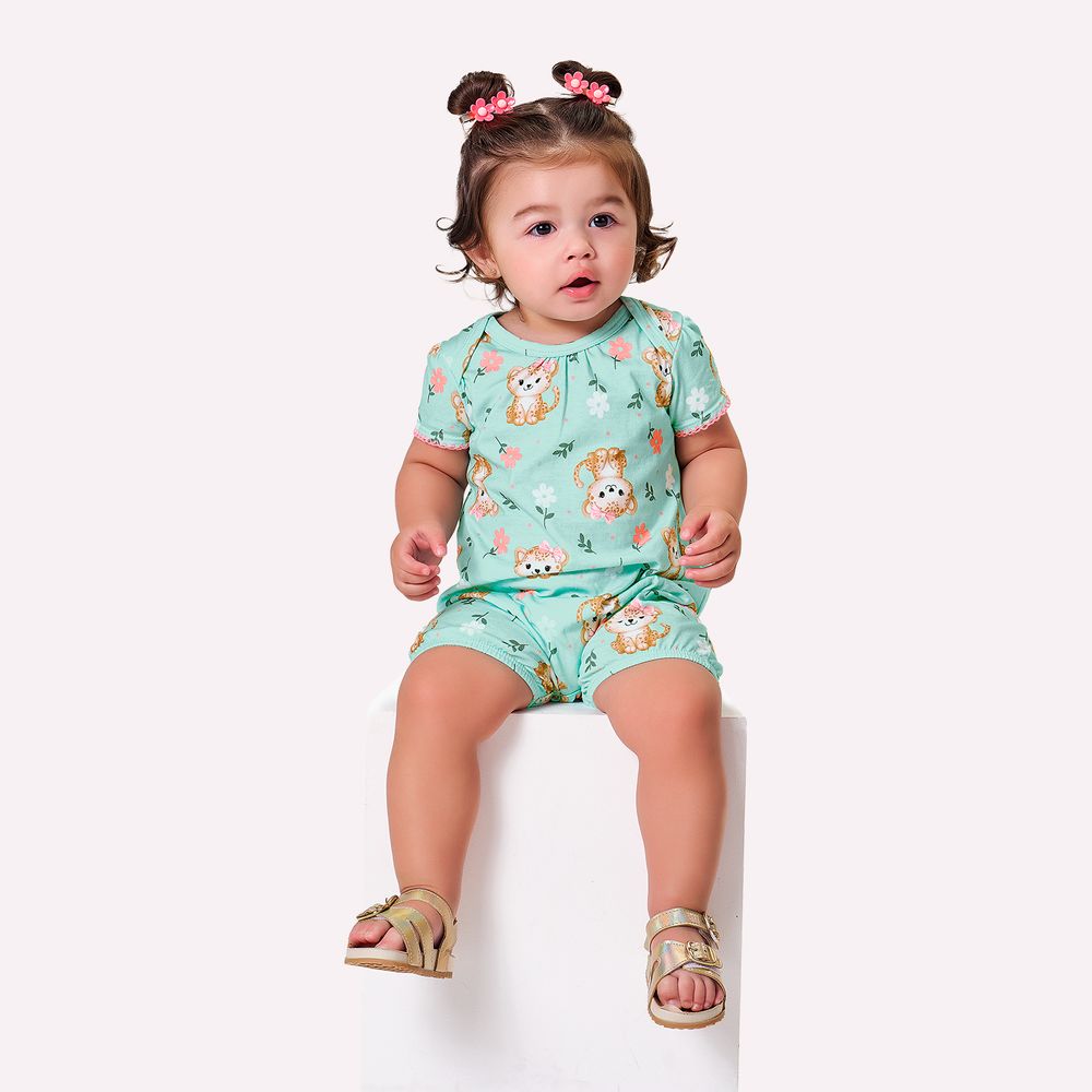 A estampa rotativa de oncinhas combinadas com delicados elementos inspirados na natureza traz um visual lúdico e acolhedor, perfeito para o dia a dia. As mangas contam com acabamento em picueta, um detalhe sutil que valoriza ainda mais a peça. Na parte inferior, os botões de pressão facilitam a troca de fraldas, oferecendo praticidade sem abrir mão do charme. Cada detalhe foi pensado com cuidado, resultando em uma peça funcional, delicada e cheia de estilo. Ideal para proporcionar conforto ao bebê e encantar em cada uso, finalizando o visual com um toque doce e especial.