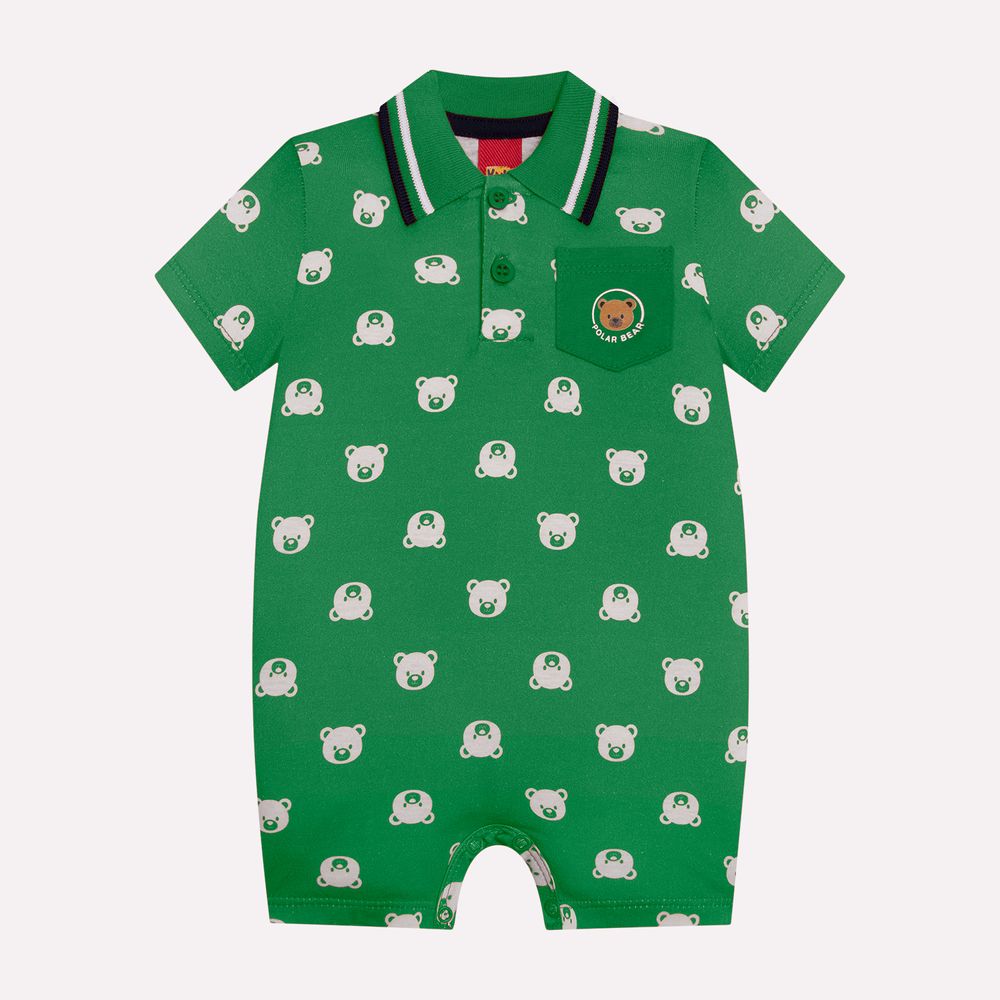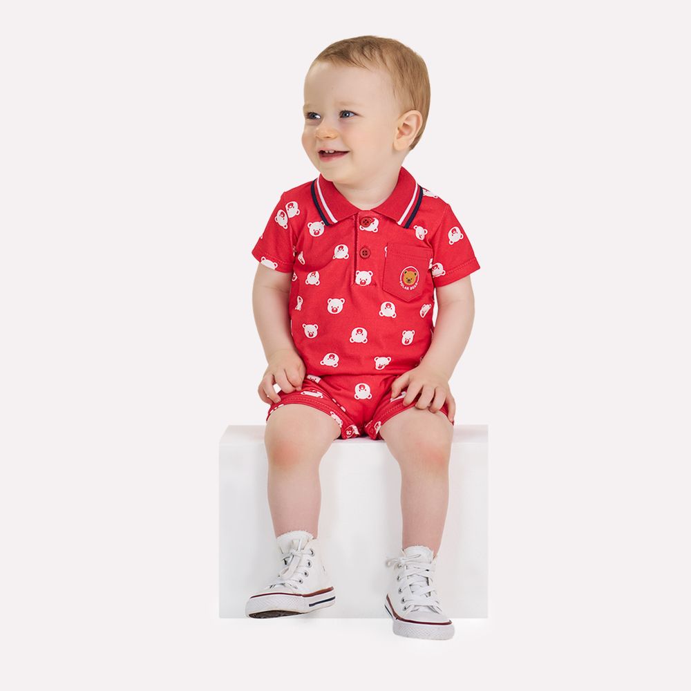 A modelagem estilo polo traz um ar sofisticado e moderno, com gola em retilínea listrada, abertura frontal com botões e mangas curtas, tornando a peça prática e elegante ao mesmo tempo. O bolso frontal com ursinho adiciona um toque de fofura, enquanto a estampa rotativa de carinhas de ursos deixa o visual lúdico e encantador.