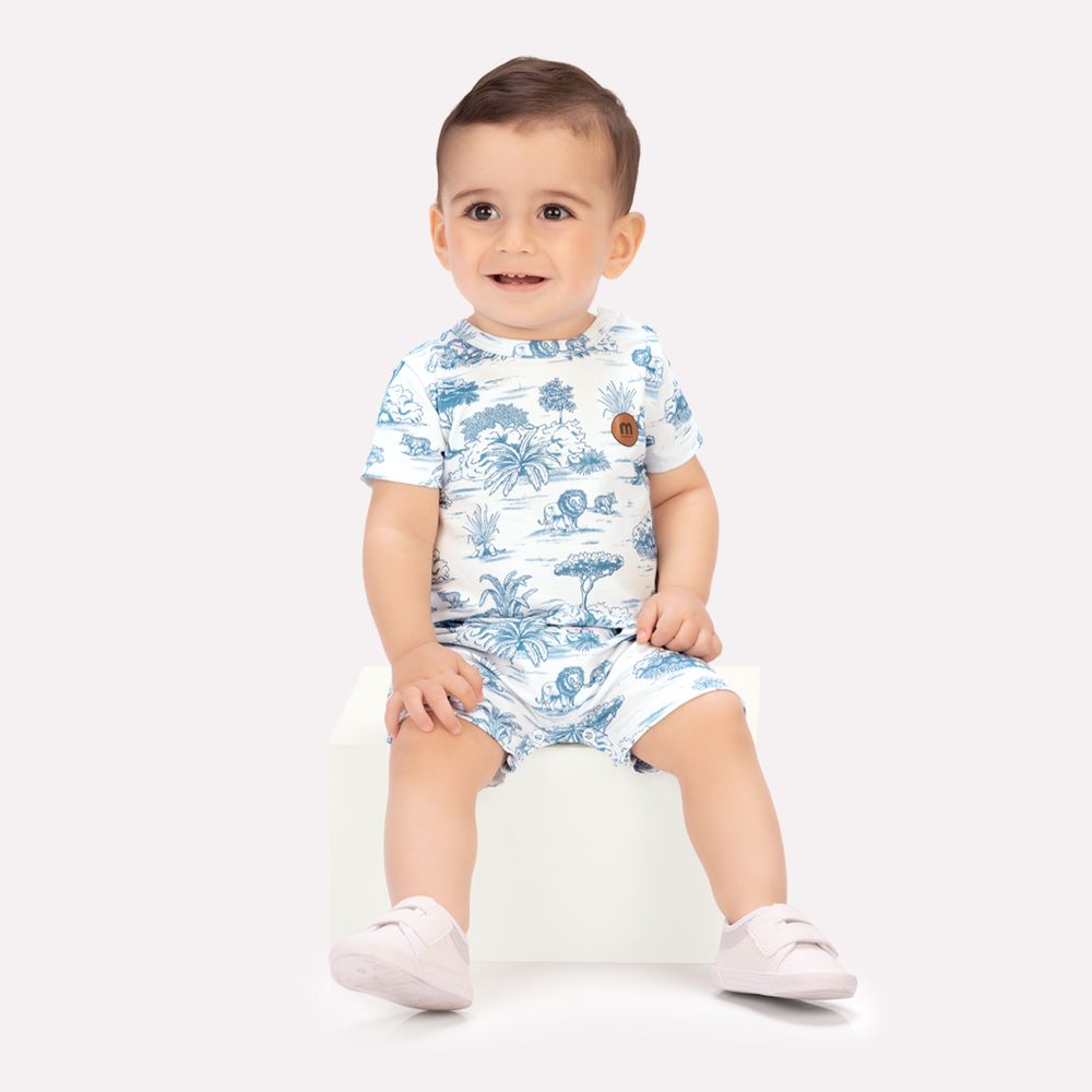 A modelagem é prática e funcional, com abertura entrepernas em botões de pressão, que facilita as trocas rápidas, e mangas curtas que deixam a peça fresquinha. O grande destaque está na estampa rotativa inspirada na selva, com tigres, leões e árvores que criam um universo lúdico e divertido para os pequenos. Além disso, o macaquinho conta com detalhes em termocolante e carimbo, que dão um toque moderno e sofisticado ao visual. Um look prático, confortável e cheio de imaginação, perfeito para acompanhar seu bebê em todas as aventuras do dia a dia.