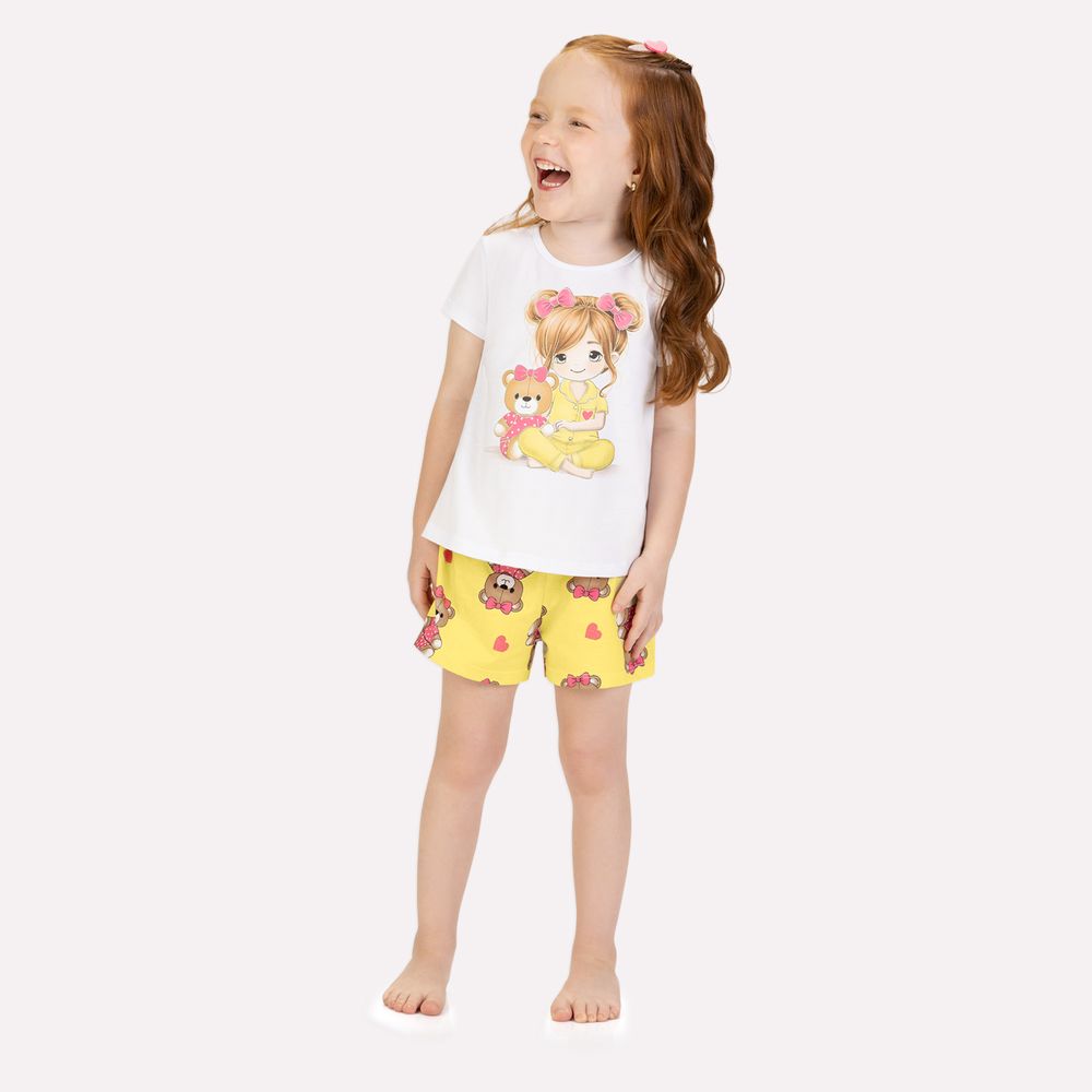 O short completa o conjunto com estampa rotativa de ursinhos e coraçõezinhos, trazendo harmonia e doçura ao look. O cós com elástico confortável assegura um caimento perfeito, acompanhando o ritmo alegre das brincadeiras antes de dormir. Um pijaminha encantador que une o conforto do algodão com o brilho da imaginação!