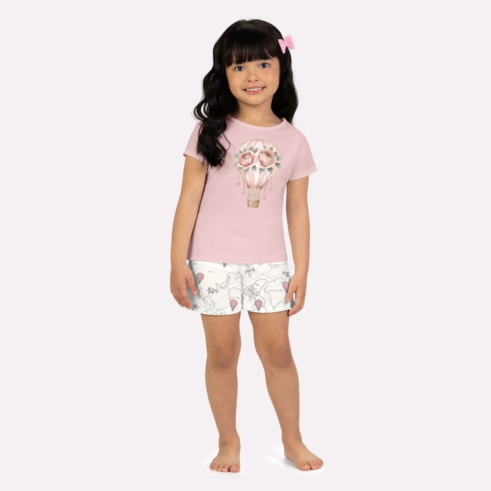 O short complementa o conjunto com a mesma delicadeza. Produzido meia malha 100% algodão, apresenta estampa de mapa com balões, criando uma narrativa suave e divertida. A modelagem confortável conta com cós elástico, garantindo ajuste perfeito sem apertar, e um delicado laço aplicado que finaliza a peça com feminilidade e cuidado nos acabamentos. Em tom rosa suave, este pijama une conforto, beleza e detalhes encantadores, tornando as noites mais aconchegantes e cheias de imaginação.