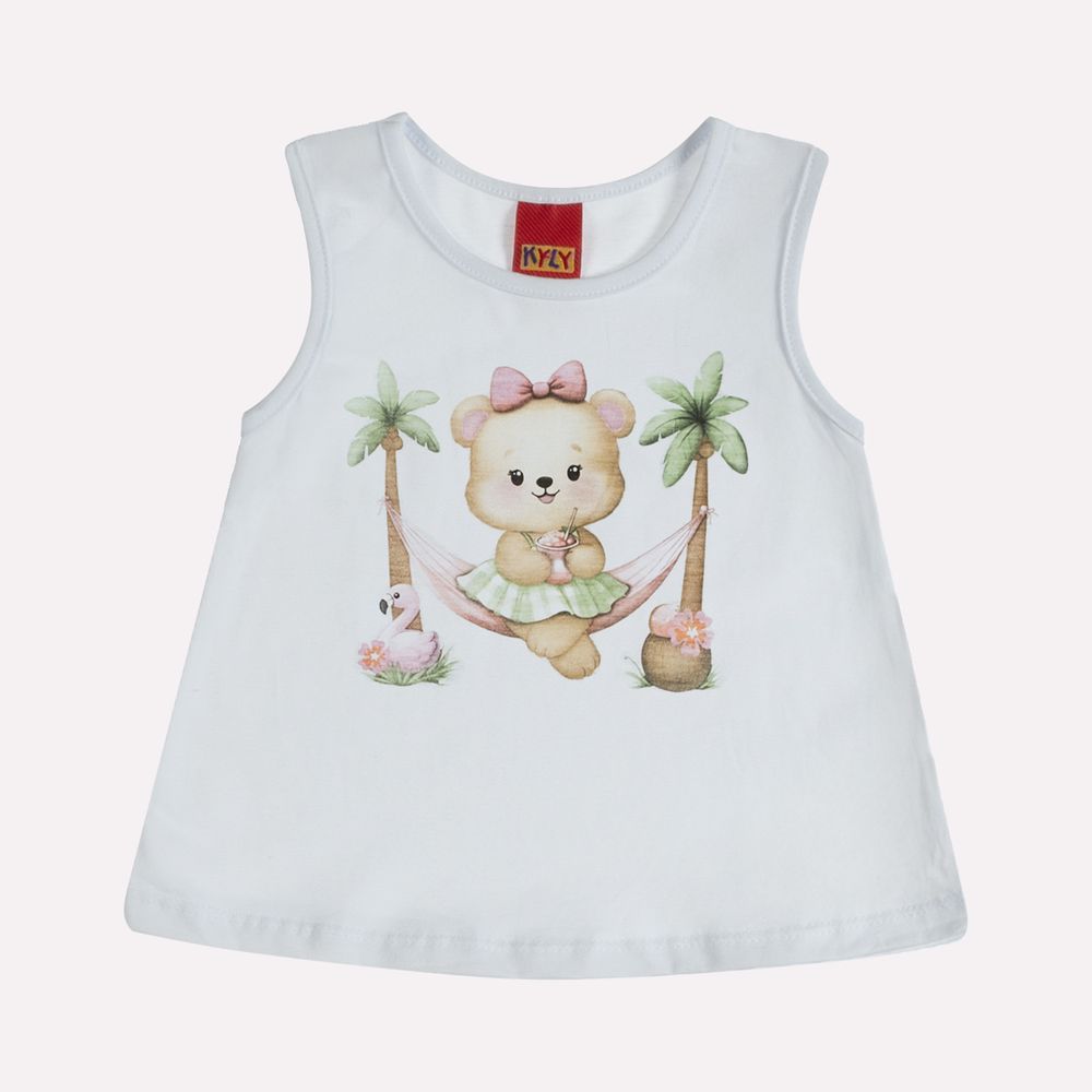 Seu charme começa pela estampa, que traz uma ursinha adorável de saia e laço, relaxando em uma rede entre palmeiras tropicais. Os detalhes como o flamingo, as flores e os coqueiros remetem a um cenário praiano lúdico e colorido, ideal para a temporada primavera-verão. A modelagem reta, soltinha e com cavas amplas valoriza o conforto térmico e permite movimentos livres, enquanto o decote arredondado proporciona um caimento delicado e seguro para o dia a dia. Uma peça encantadora e prática, perfeita para compor looks leves e cheios de personalidade.