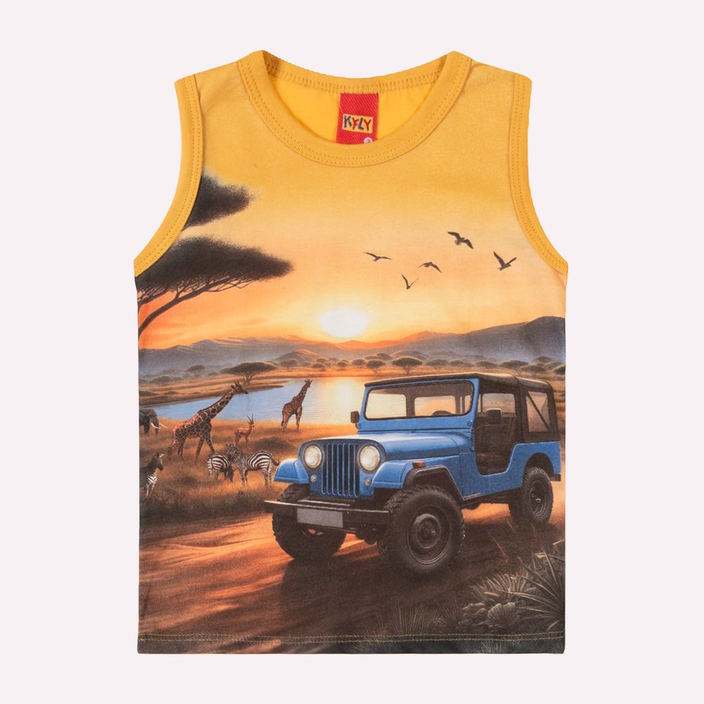 Prepare-se para uma viagem cheia de imaginação com a regata infantil menino Kyly. Confeccionada em meia malha 100% algodão, a peça garante conforto absoluto, toque macio e excelente respirabilidade, ideal para os dias mais quentes. Com uma estampa exclusiva de safári ao entardecer, a regata traz um visual vibrante e inspirador, com um jipe em meio à selva, rodeado por girafas, zebras e elefantes, sob um pôr do sol dourado e majestoso. O cenário selvagem e detalhado estimula a imaginação e convida a criança para aventuras incríveis.