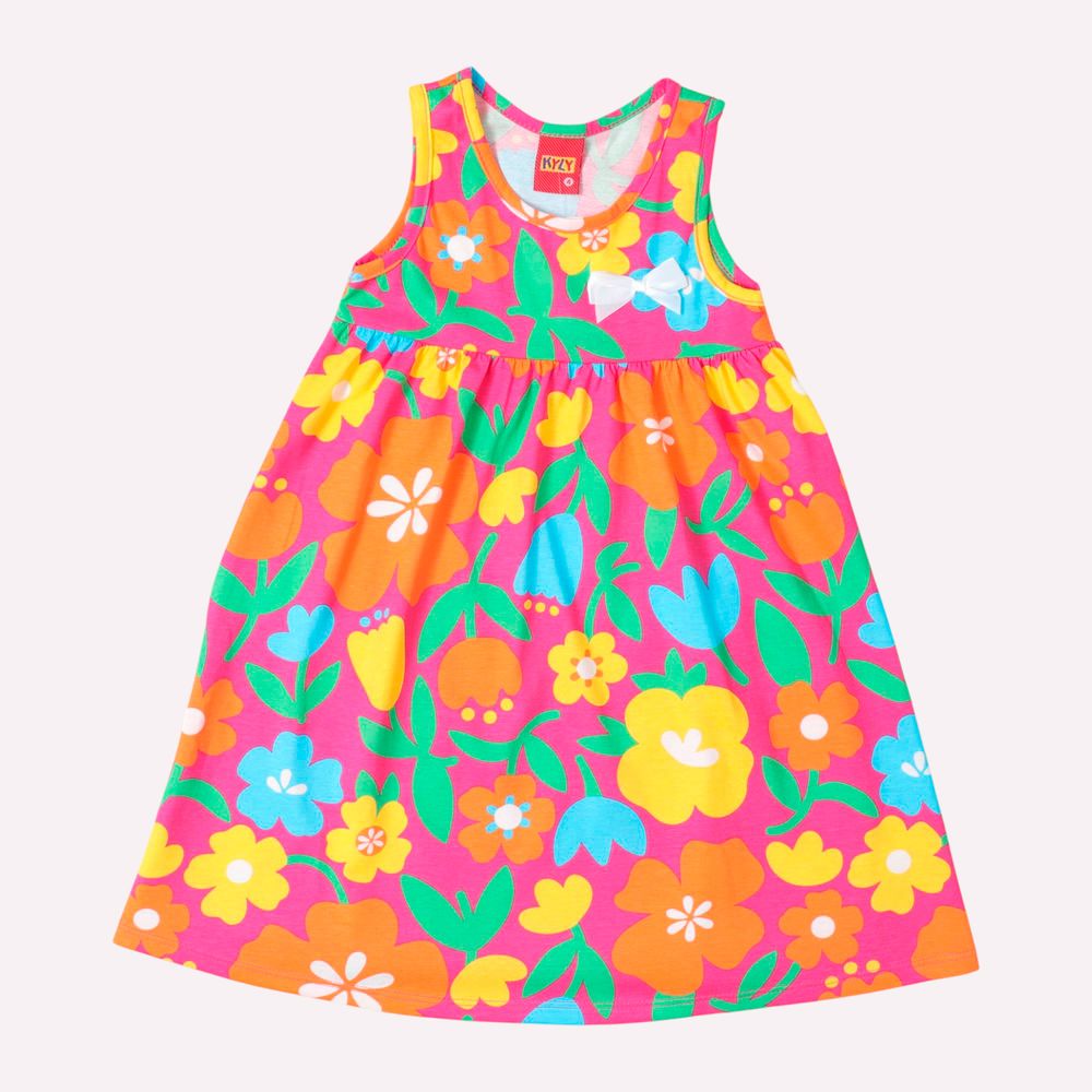 O vestido infantil menina Kyly em meia malha 100% algodão apresenta modelagem godê, com caimento leve e soltinho, perfeito para o verão. Sua estampa vibrante mistura flores delicadas, folhagens tropicais e detalhes encantadores, criando um visual cheio de vida.