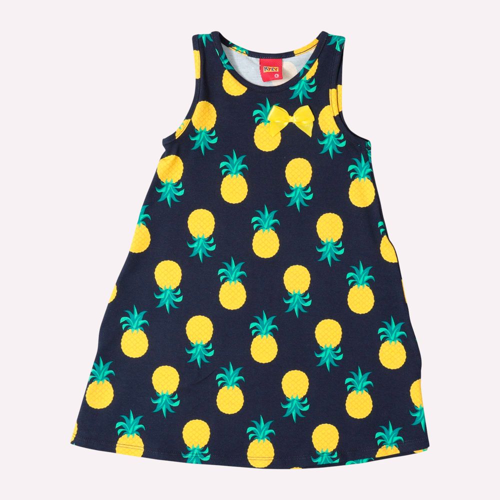 Sua modelagem regata com caimento evasê soltinho proporciona liberdade de movimento, enquanto a estampa divertida com abacaxis e folhagens deixa o visual ainda mais encantador e vibrante. Um look leve, moderno e divertido que combina fofura e conforto para os dias ensolarados de verão.