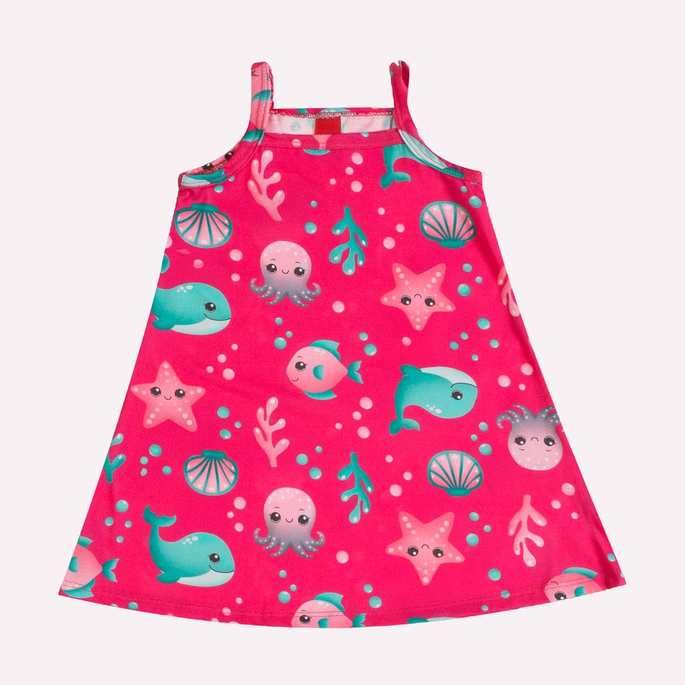 O destaque do modelo fica por conta da estampa, que transforma o vestido em uma verdadeira imersão lúdica no mundo subaquático. Peixinhos, baleias, estrelas-do-mar, conchas e bolhas compõem um cenário encantador em cores vibrantes, despertando a imaginação infantil e tornando o look ainda mais divertido. Perfeito para passeios, festas ao ar livre e momentos especiais do dia a dia, este vestido une estilo lúdico, conforto e qualidade em uma peça encantadora e atemporal.