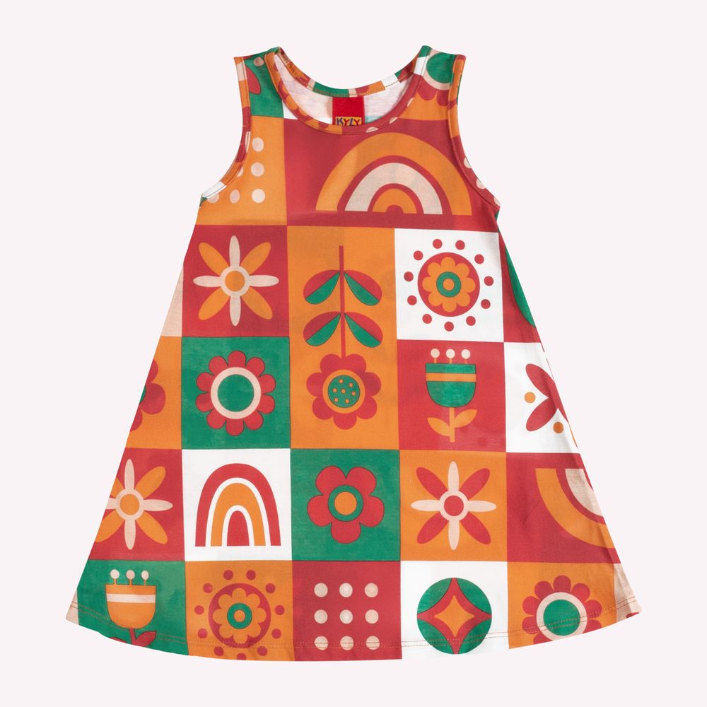 A modelagem traz um caimento soltinho que favorece o movimento e confere fluidez à peça. Seu grande destaque é a estampa de flores em blocos geométricos multicoloridos, moderna, divertida e cheia de personalidade, que transforma a peça em um verdadeiro jardim gráfico, repleto de formas e cores vibrantes. Esse vestido é perfeito para iluminar qualquer ocasião com um toque especial de encanto.