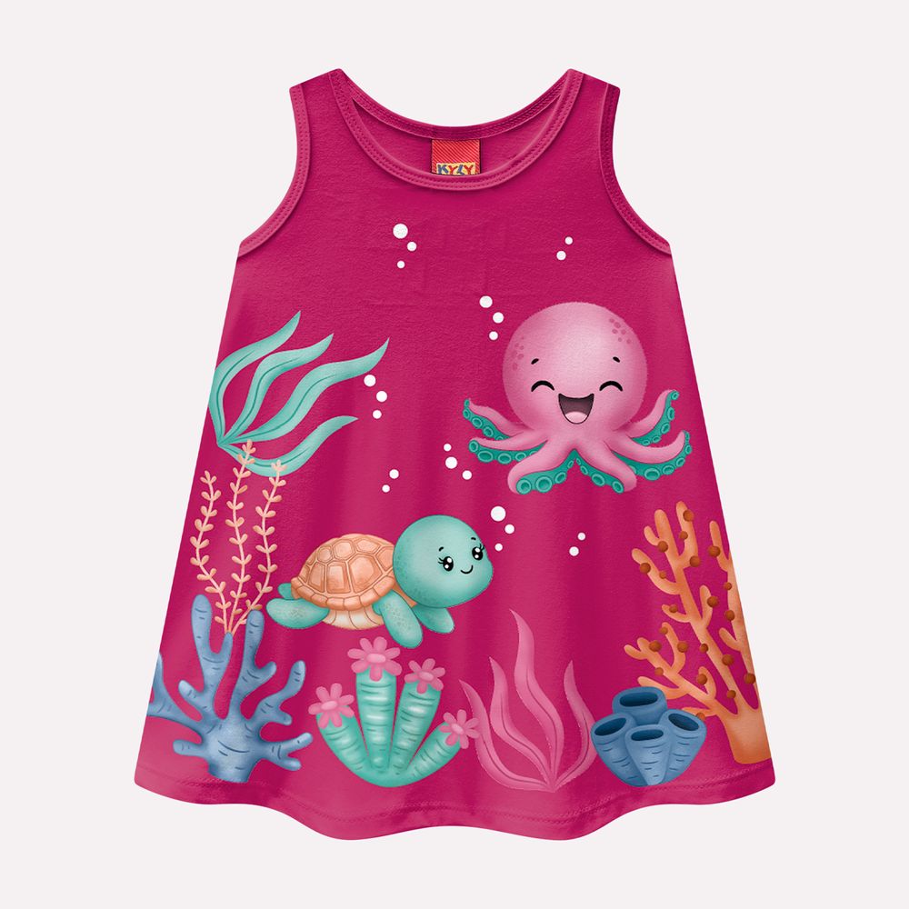 A modelagem soltinha e fluida proporciona liberdade de movimento, enquanto o decote redondo e as cavas confortáveis mantêm o visual moderno e fresquinho. A estampa vibrante com polvo, tartaruga, algas e corais coloridos cria uma atmosfera lúdica e divertida, transformando o look em uma verdadeira viagem ao fundo do mar. Um vestido irresistível, cheio de personalidade e perfeito para acompanhar momentos de alegria e descobertas!