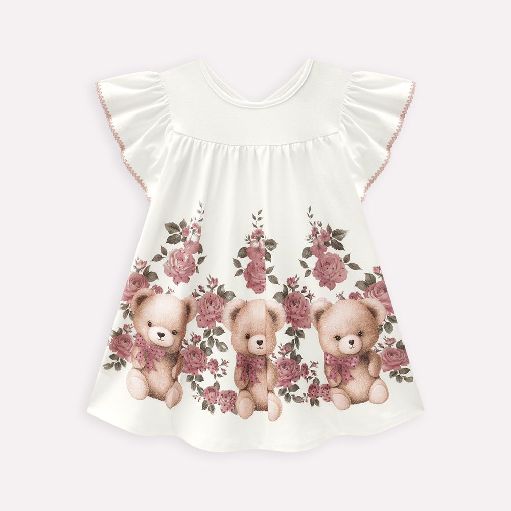 Confeccionado em cotton 95% algodão e 5% elastano, o modelo oferece toque suave e elasticidade ideal para acompanhar cada movimento da criança com leveza. O grande destaque da peça é a encantadora estampa com ursinhos e flores, aplicada com precisão na barra, trazendo personalidade e um ar lúdico ao visual. O brilho sutil do strass aplicado sobre as flores acrescenta um toque de glamour delicado, tornando o vestido ainda mais especial.