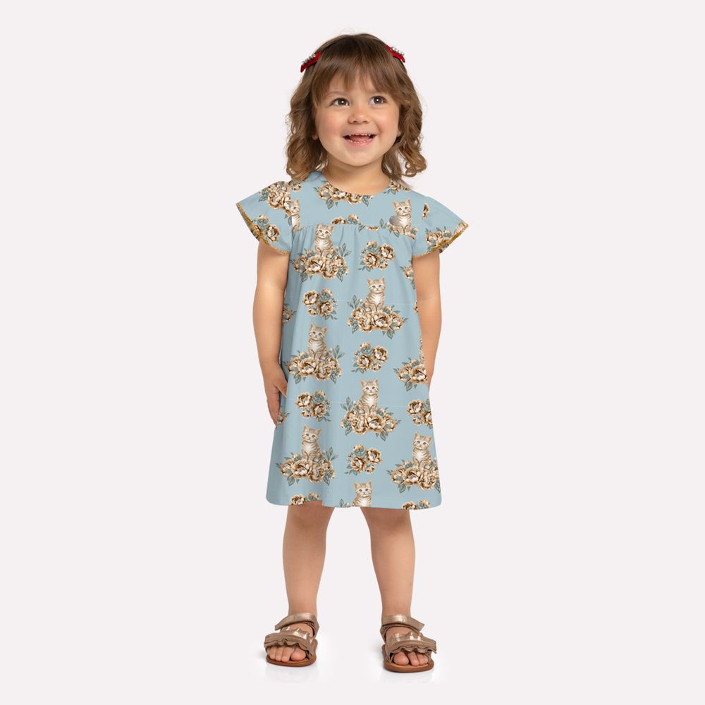 A estampa rotativa de gatinhos entre flores traz um toque lúdico e sofisticado, enquanto os babadinhos nas mangas com acabamento em picueta deixam o visual ainda mais gracioso. Um vestido encantador, que une ternura e estilo em um só look, perfeito para momentos especiais ou para deixar o dia a dia mais alegre e elegante!